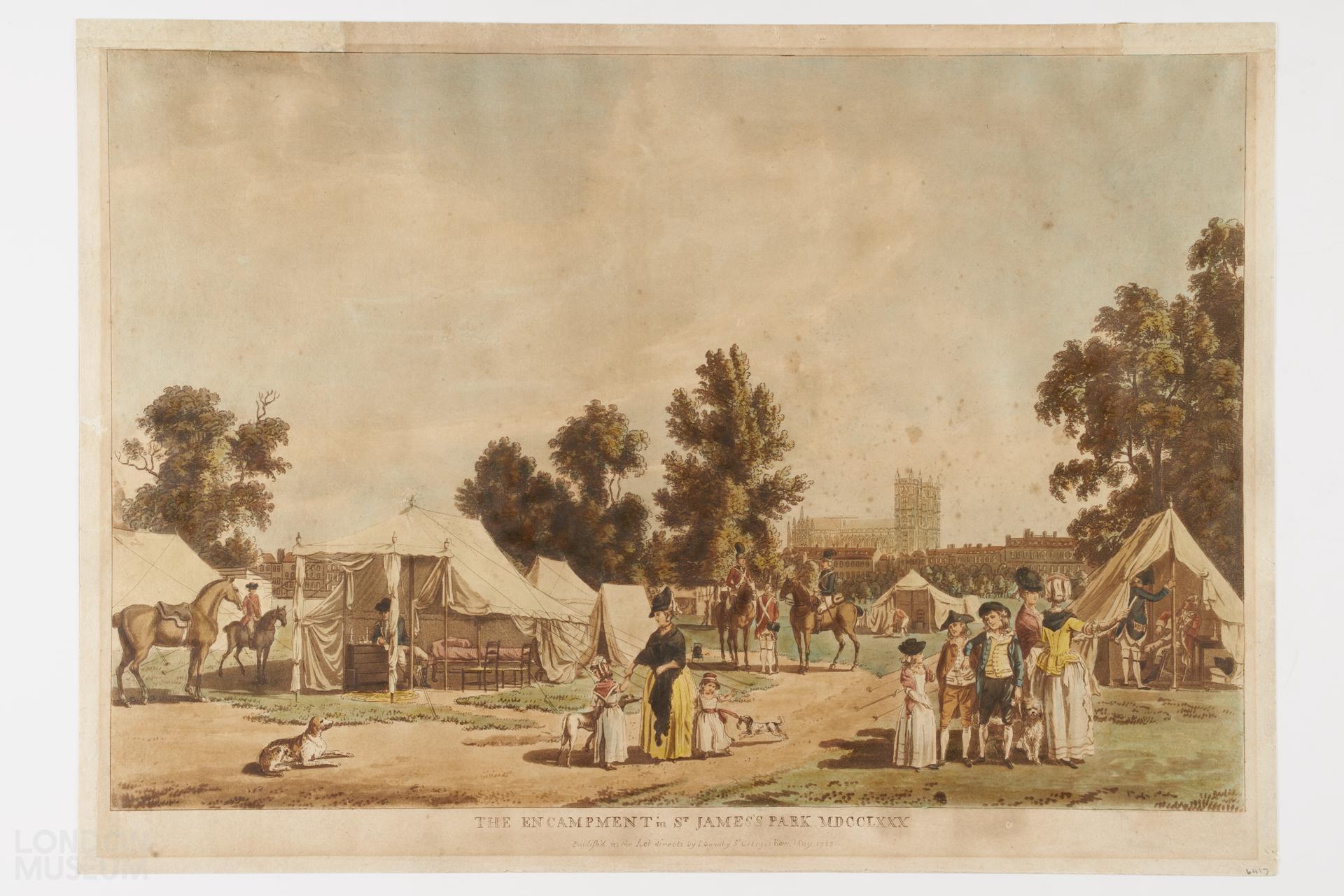 The army encampment in St James's Park after the Gordon Riots, with visiting women, children and dogs. Westminster Abbey in the distance. Same as A18105.