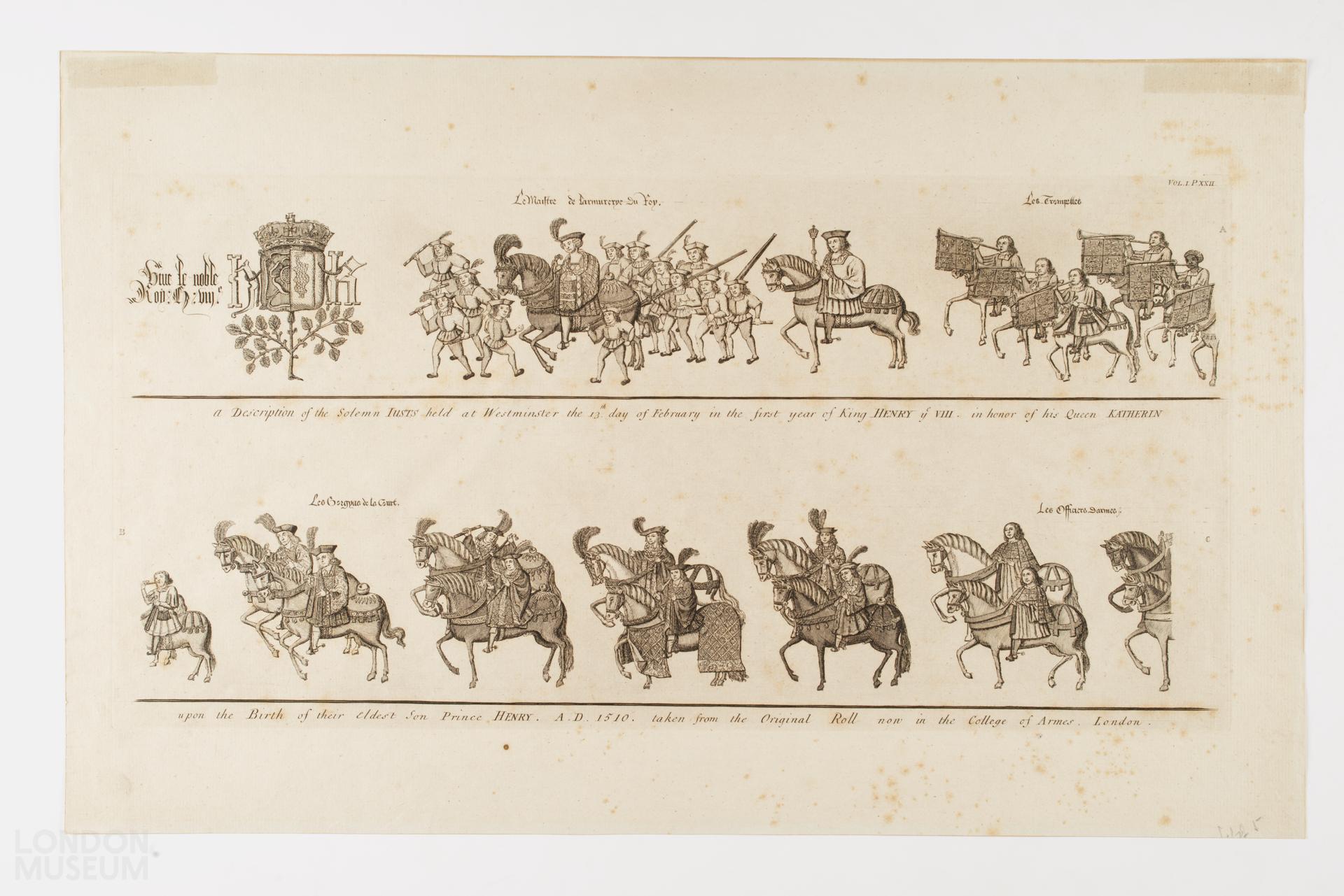 The first of a series of five engravings (Vol. I. P. XXII to XXVI) 'taken from the Original Roll now in the College of Armes, London' portraying '. . . the Solemn Justs [jousts] held at Westminster the 13th day of February in the first year of King Henry VIII in honor (sic) of his Queen Katherin (sic) upon the Birth of their eldest Son Prince Henry. A.D. 1510'. The reproduction is in two strips, with a lettered key to how they join up which runs through the series.