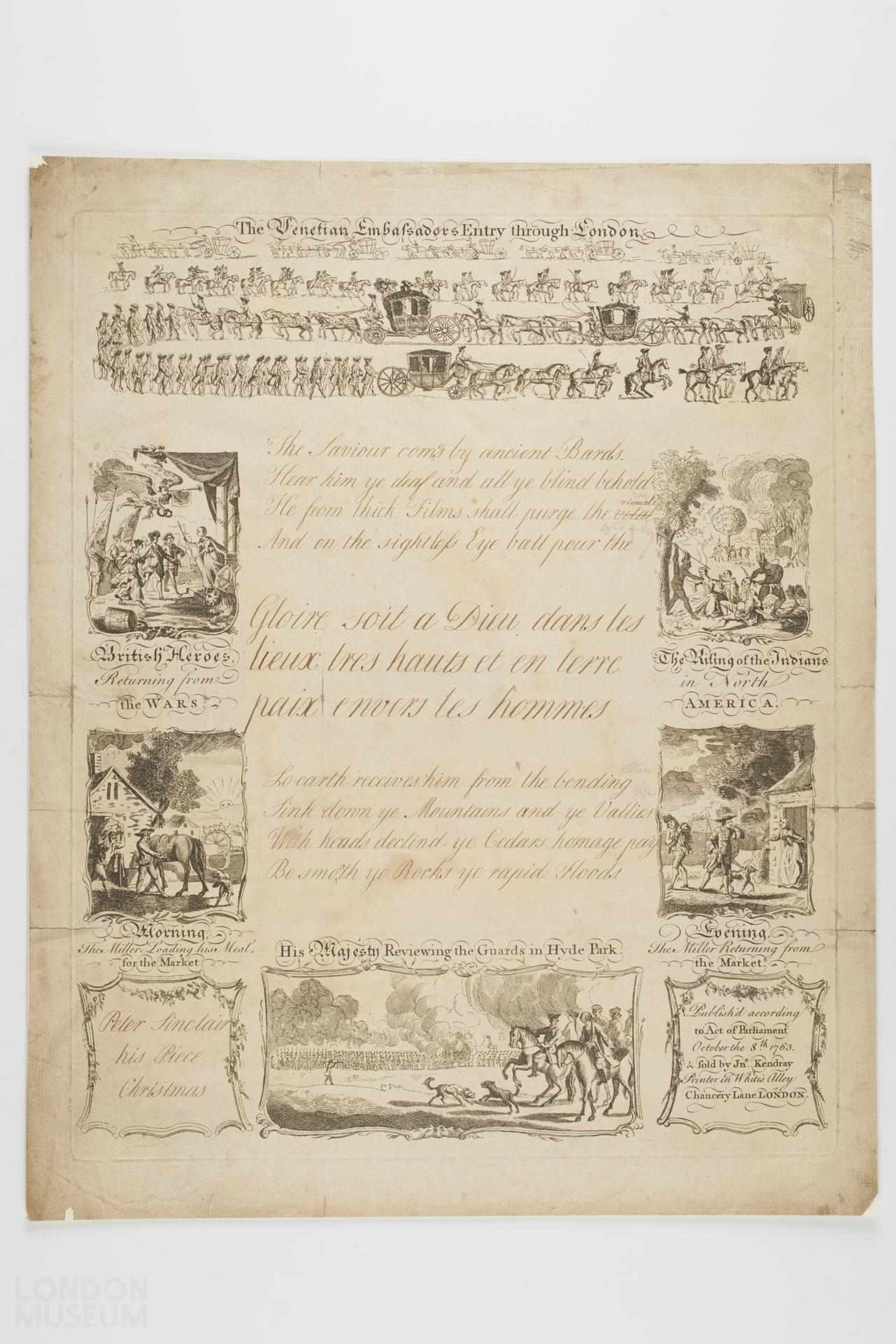 Decorated handwriting exercise sheet which has been used by someone signing themselves "Peter Sinclair, his Piece, Christmas". He has inscribed three texts appropriate to Christmas in the blank central panel. Apart from the procession of the Venetian ambassador, there is (bottom centre) His Majesty Reviewing the Guards in Hyde Park, and (left) British Heroes returning from the Wars (with angels blowing trumpets overhead), and Morning: The Miller Loading his Meal for the Market; and on the right The Rising of the Indians in North America (threatening European captives withspears and scalping), and Evening: The Miller Returning from the Market.