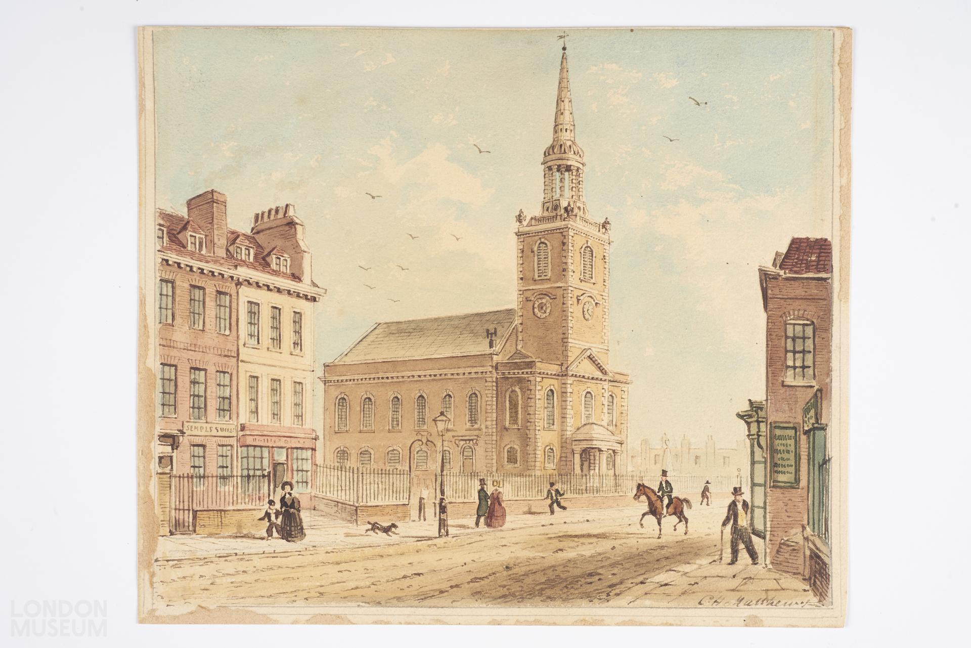Exterior of St Mary's Parish Church, Islington. Signed C.H. Matthews, c. 1860.