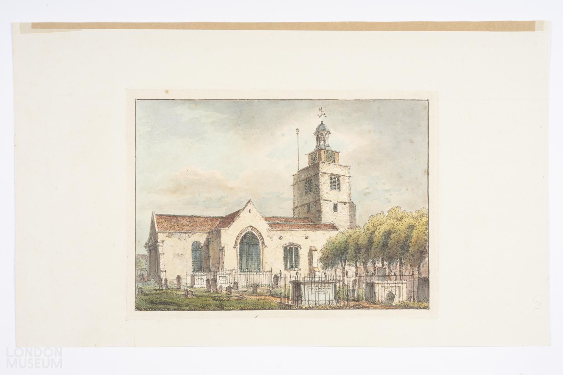 Exterior view of Hammersmith Church and graveyard (St Paul's). Inscribed in pencil on verso: 'Hammersmith, Aug. 2nd 1796'. Engraving was published by W. Miller, 1811 in 'Ecclesiastical Topography, 100 view of Churches in the Environs of London' by Samuel Woodburn.