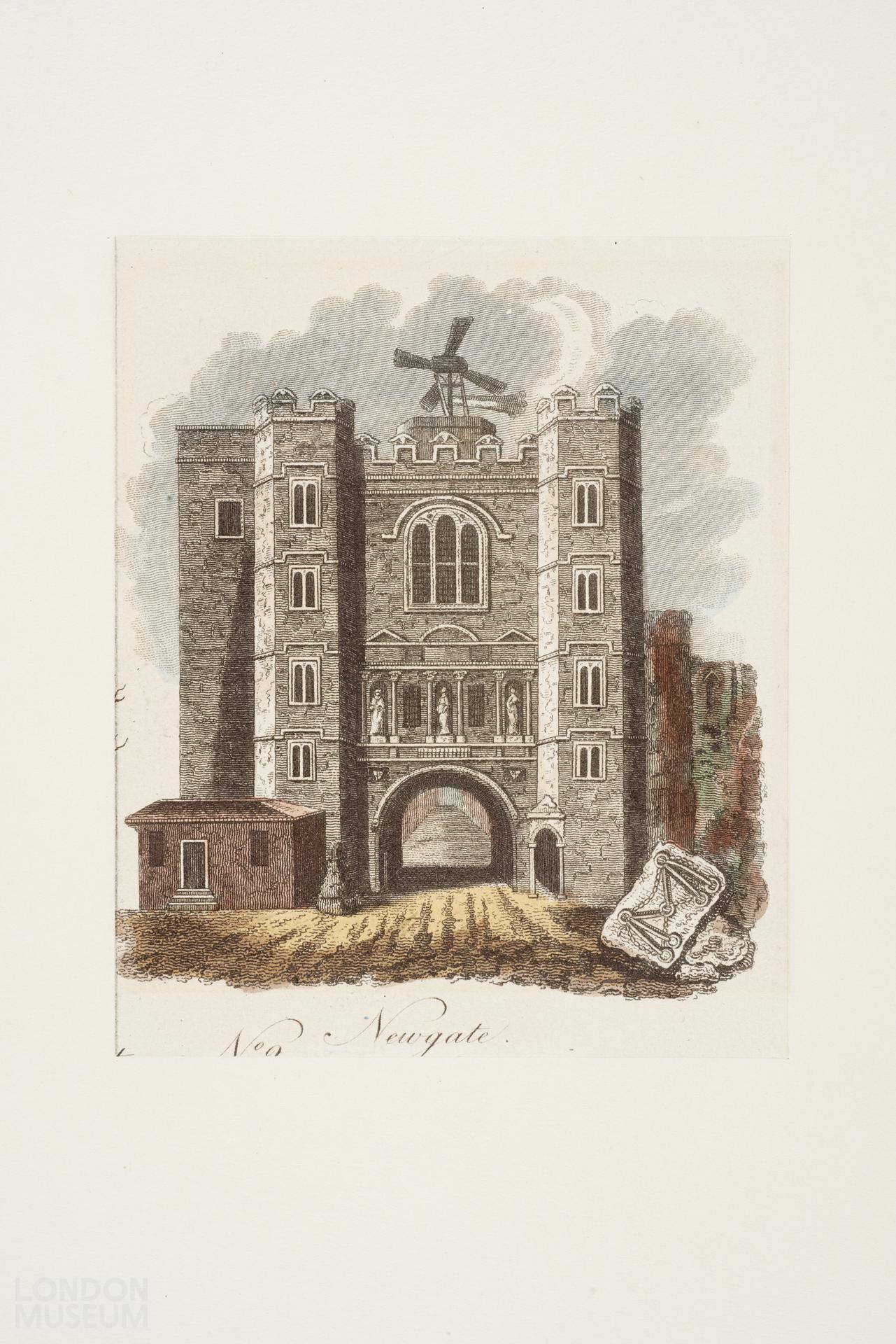 View of the gate into Newgate Prison. A ventilation windmill was placed on top of the gate in the 1760s to provide more ventillation to the cells after outbreaks of disease struck the prison and courts.