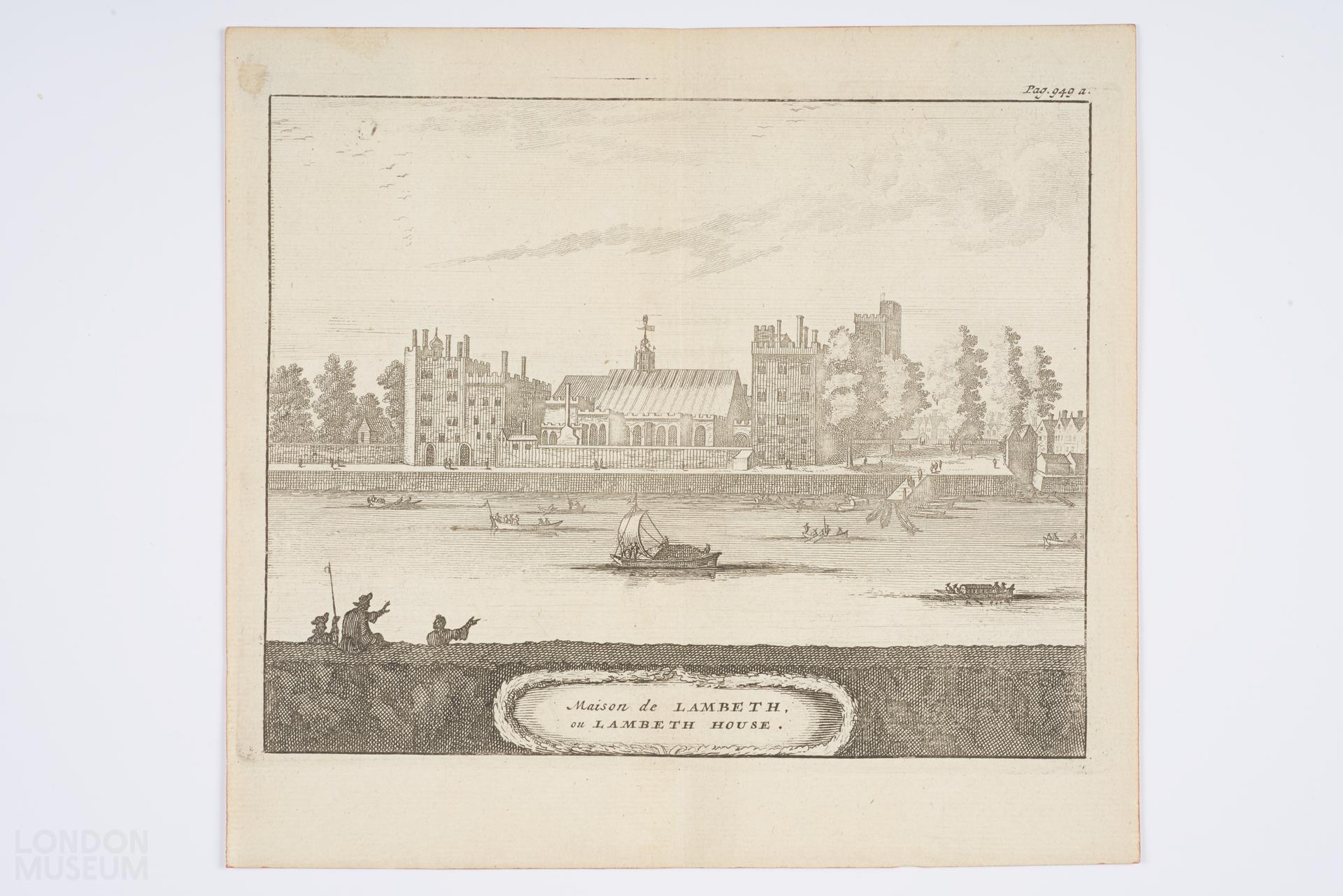 View of Lambeth Palace from Westminster. French print possibly derived from Hollar. Inscribed in ink at top right: 'Pag.949a'.