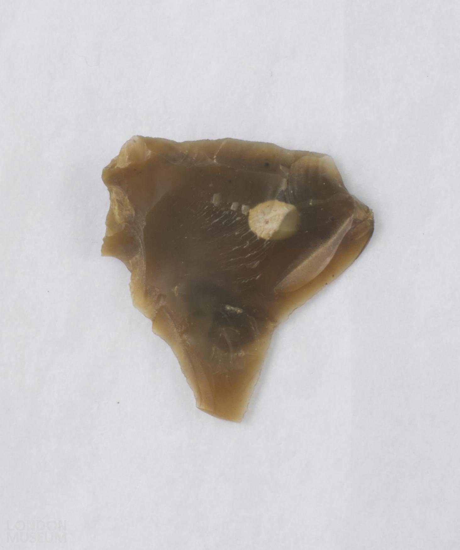 Flake of greyish-brown flint with facets and damage on one side. Found with Late Iron Age pottery 81.451.