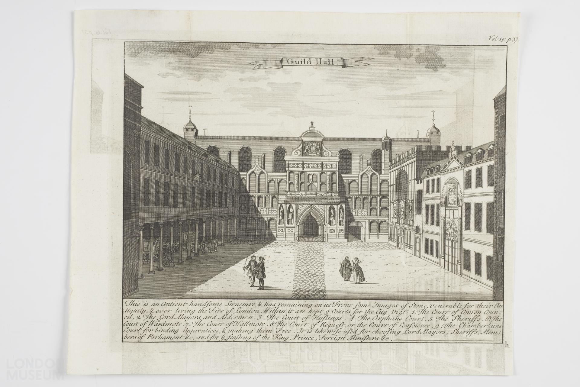 Exterior view of the Guildhall courtyard. Engraving of Guildhall with people in the foreground.