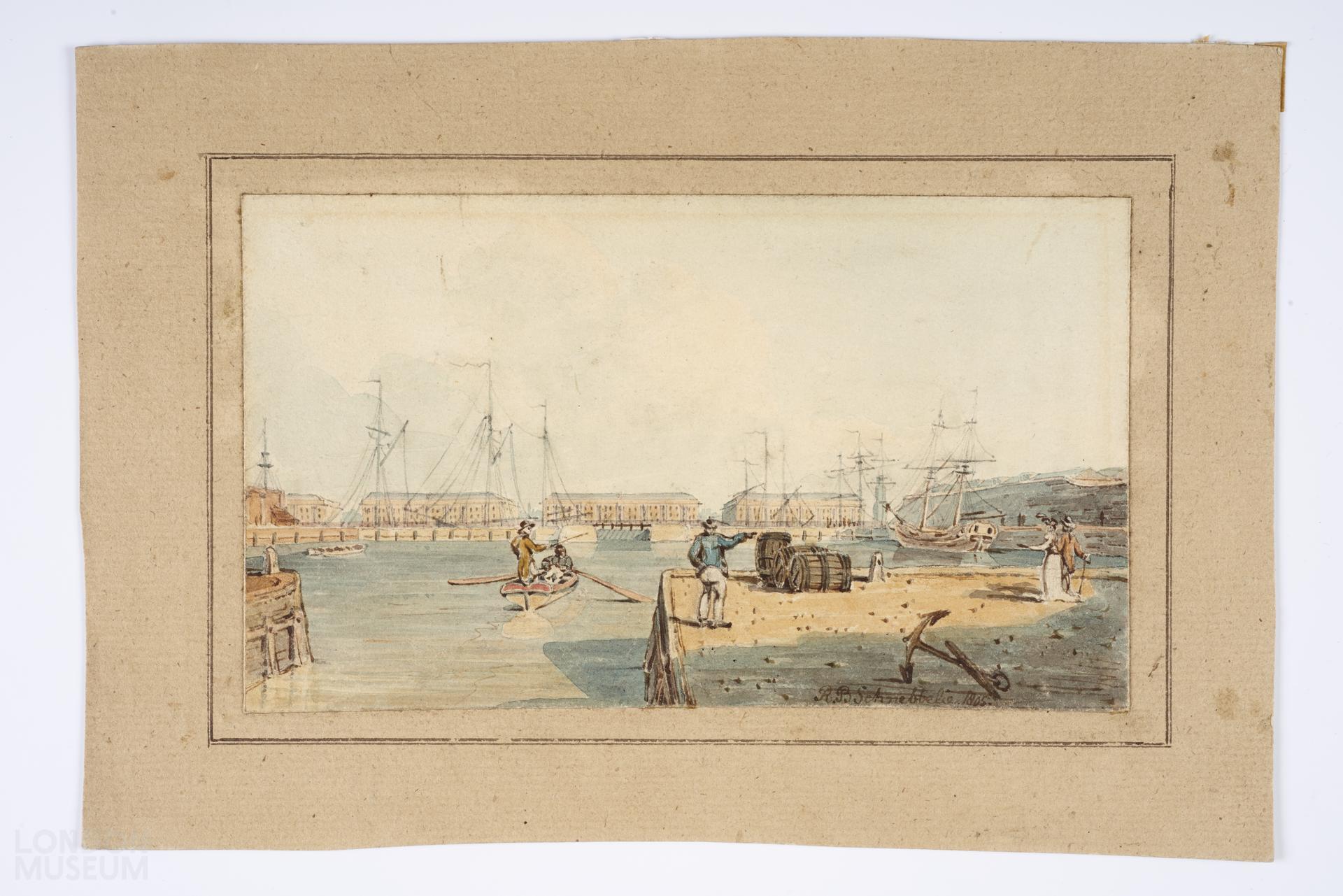View of the India Docks. Signed and dated. Engraved in Hughson's London Vol 4 p. 449. Inscribed on reverse 'RB Schnebbelie, 39 Berwick Street, Soho, 1805'. Schnebbelie was active 1803-21, d. 1849 of starvation.