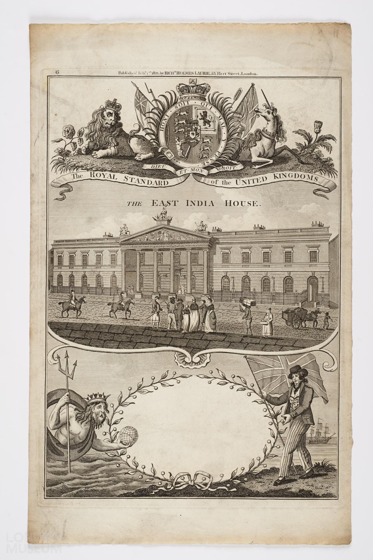Frontispiece with The Royal standard of the United Kingdom, The East India House and posidon with Britain ruling the waters print
