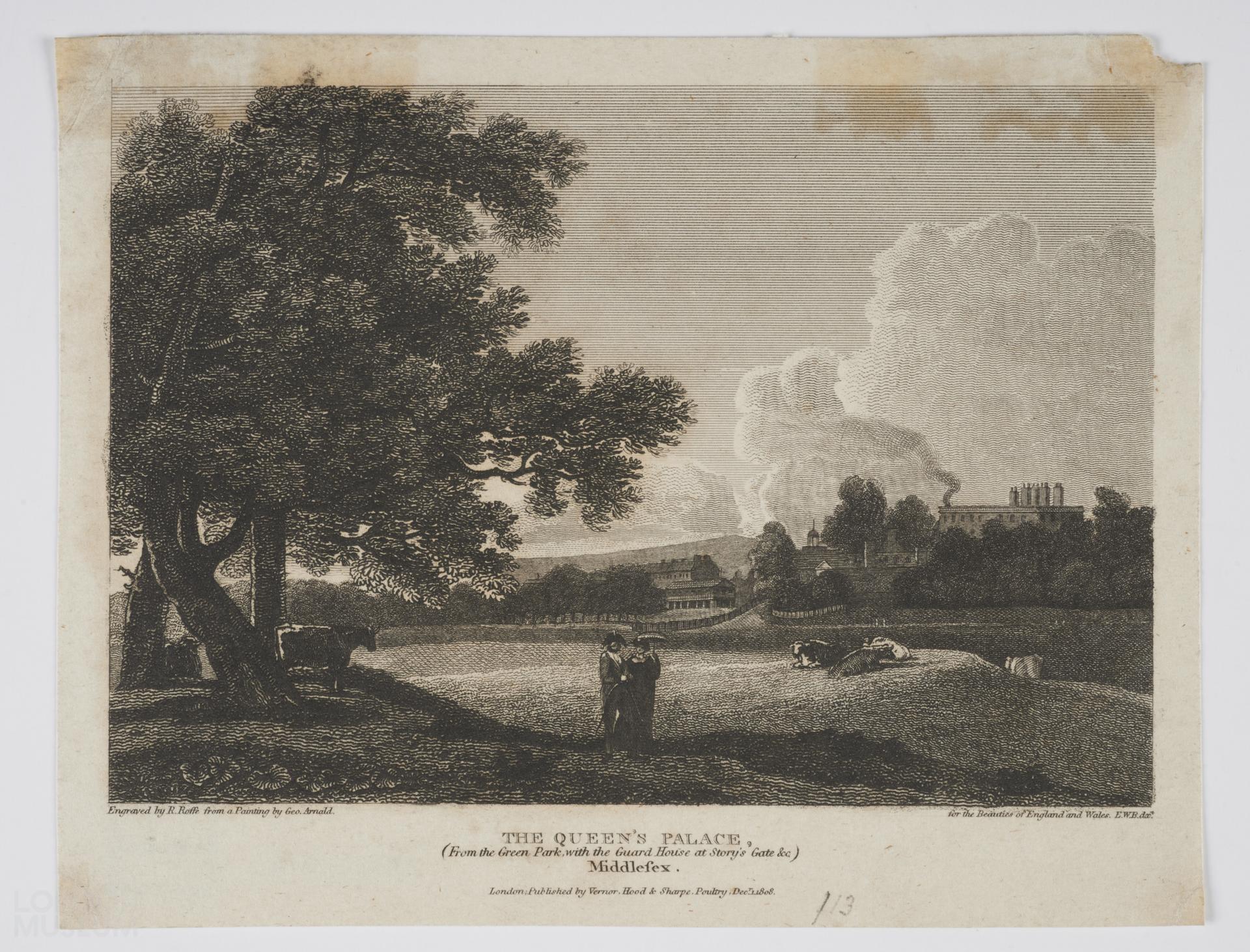 View of the Queen's Palace, from Green Park, with the Guard House at Story's Gate, etc, Middlesex. Produced for the 'Beauties of England and Wales', (1801-16).