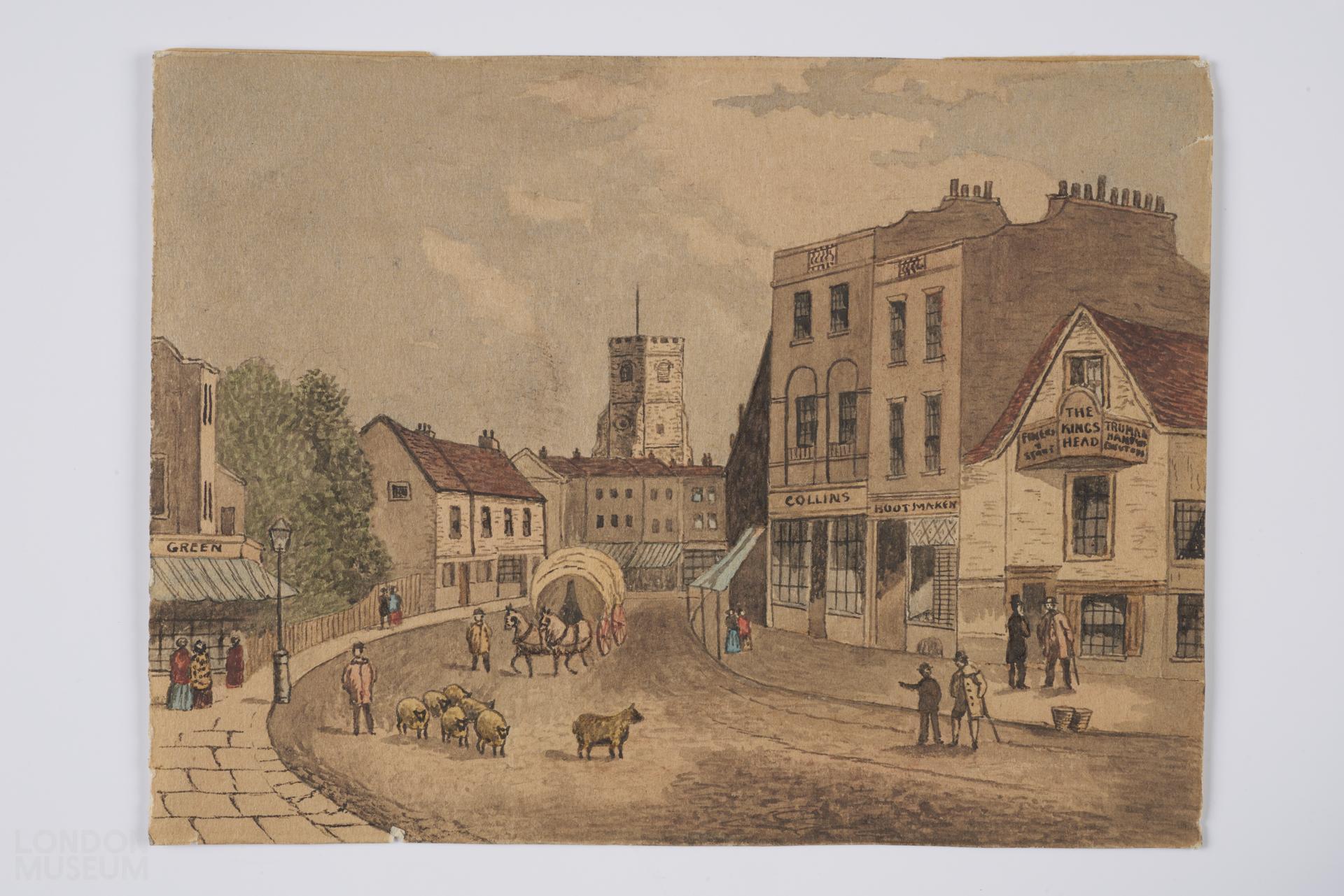 Street scene in Mare Street, Hackney, with signs for 'The King's Head' and 'Collins bootmaker', sheep are herded down the street.