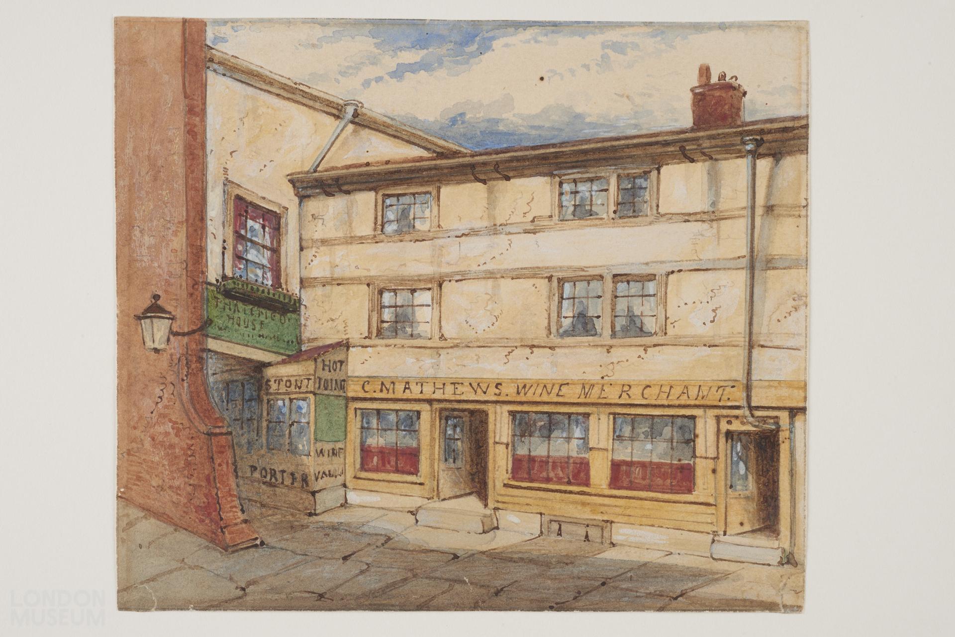 Street scene with signs for 'C. Mathews Wine Merchant' and 'Old Thatched House' Strand. Formerly the dairy of Nell Gywnne.
