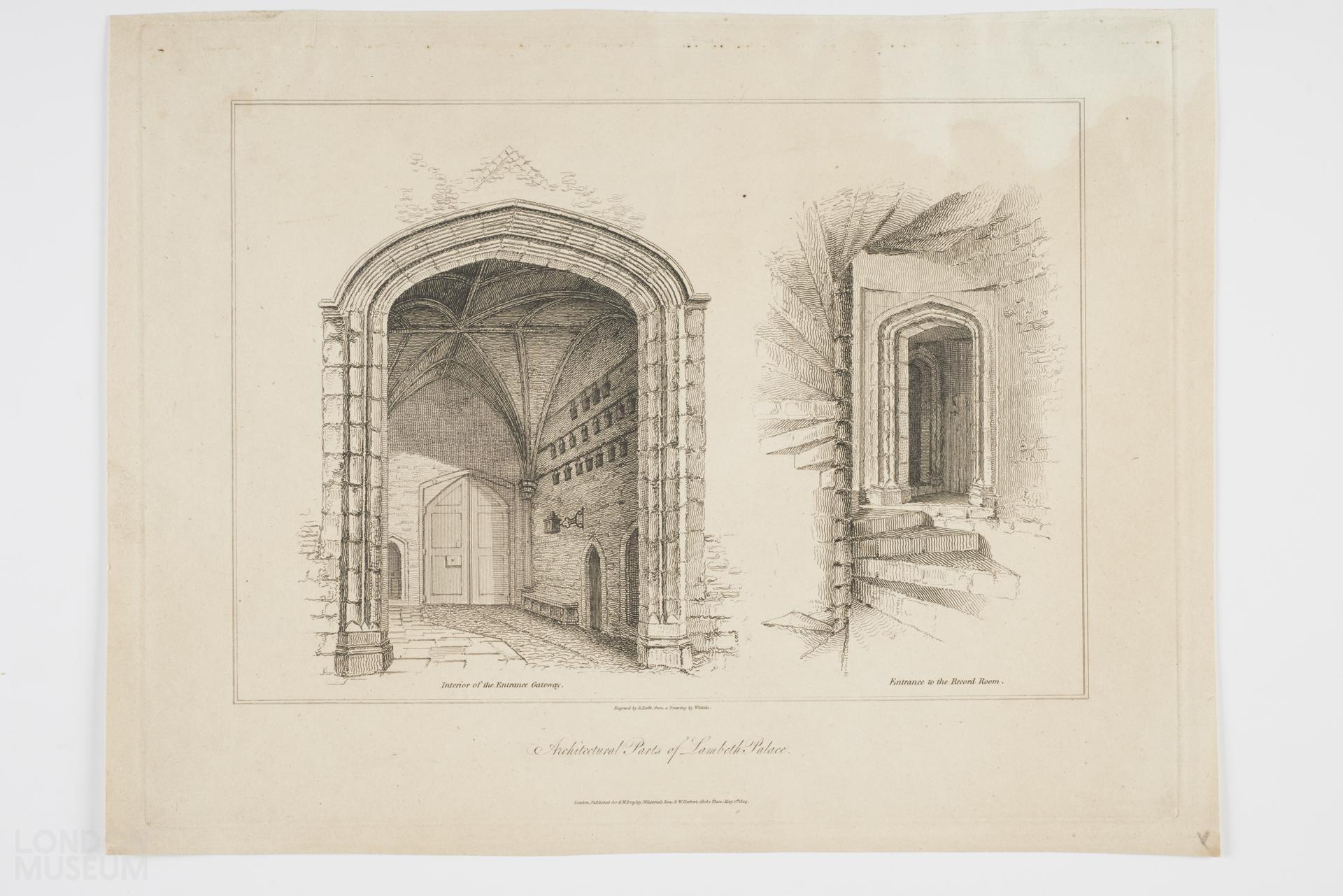 Two views of Lambeth Palace, the interior of the Entrance Gateway and the entrance to the record room.