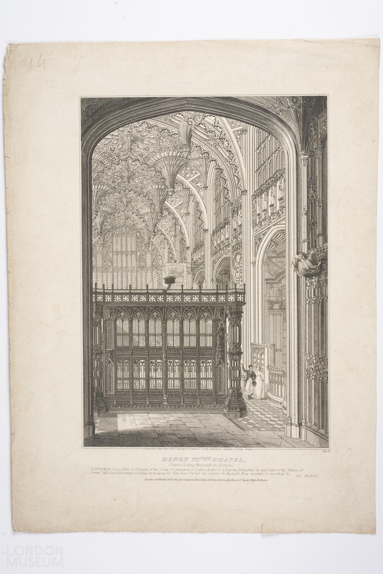 Inscription under image reads: 'To Wm Bray Esqr, Fellow and Treasurer of the Society of Antiquaries of London, Author of 'a Tour into Derbyshire' &c and Editor of 'The History of Surrey' this plate (representing a building at the laying the first stone of which his relation Sir Reginald Bray, assisted) is inscribed by the Author'.
