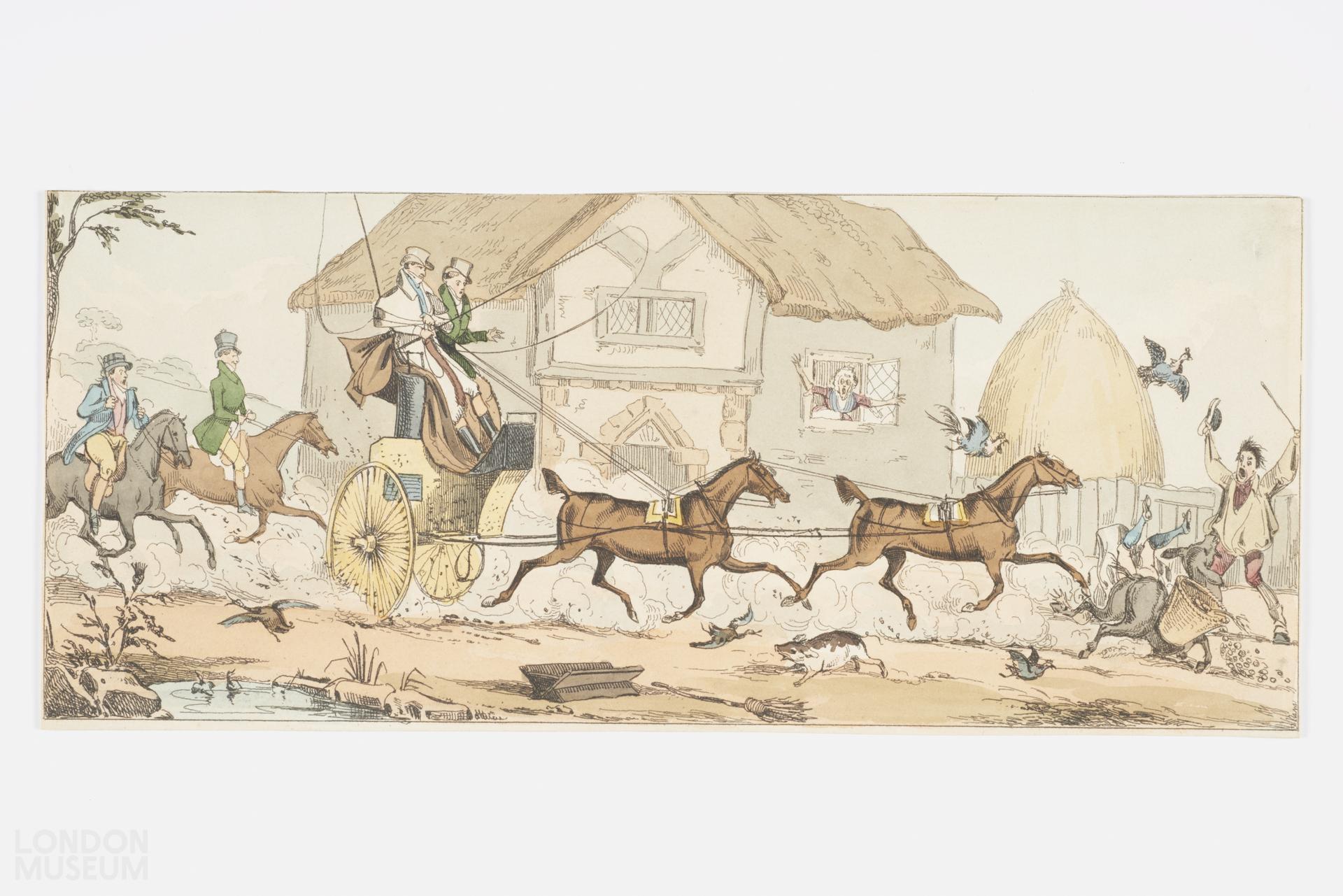 From Fashion and Folly. A Casual Spill, Jack asses should keep out of the way. A carriage tramples a small donkey by a country house.