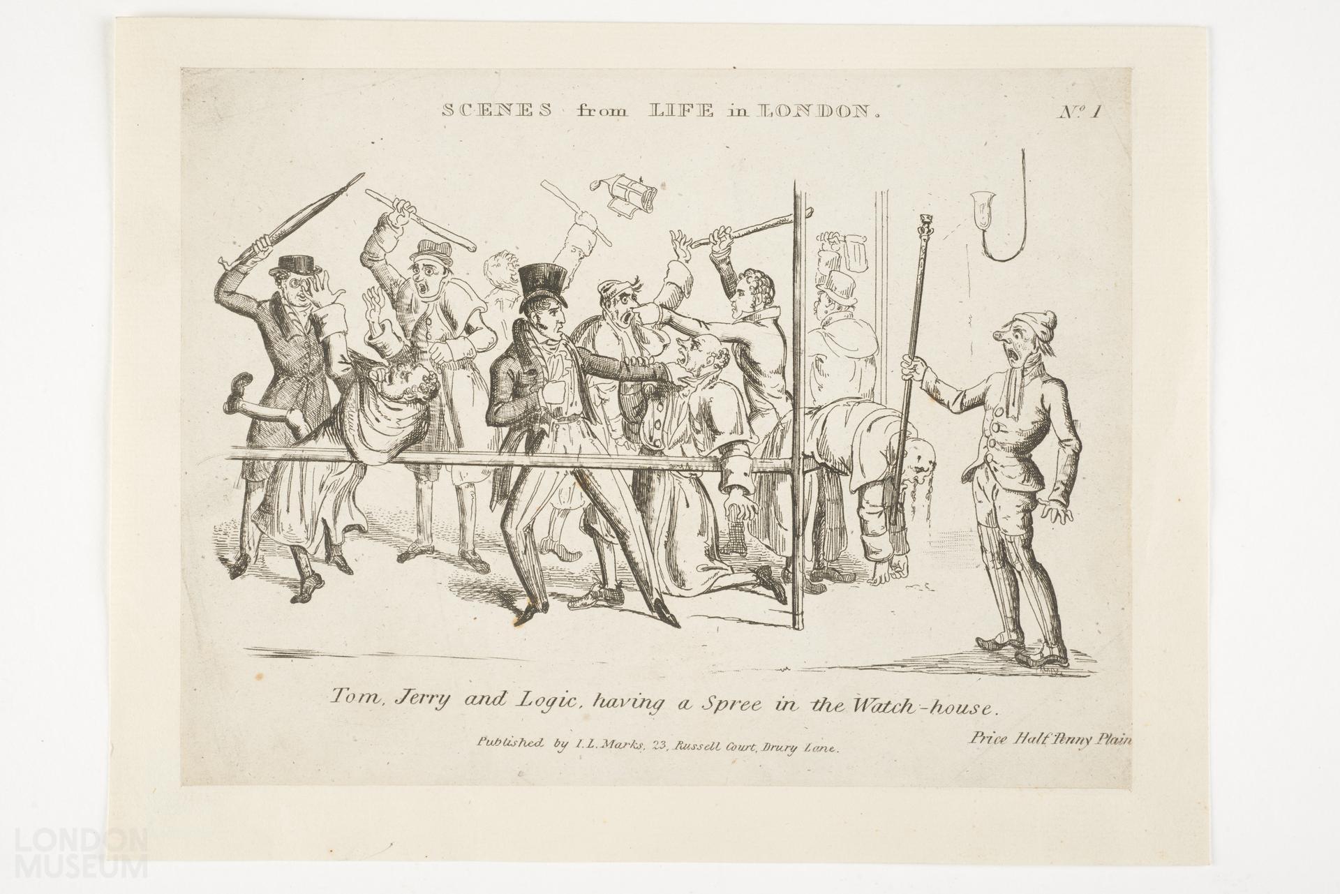Illustration of Tom, Jerry and Logic having a spree in the watch-house from Pierce Egan's Life in London; or, The Day and Night Scenes of Jerry Hawthorn, Esq. and his elegant friend Corinthian Tom, accompanied by Bob Logic, The Oxonian, in their Rambles and Sprees through the Metropolis', a work which was issued in and after July, 1821.