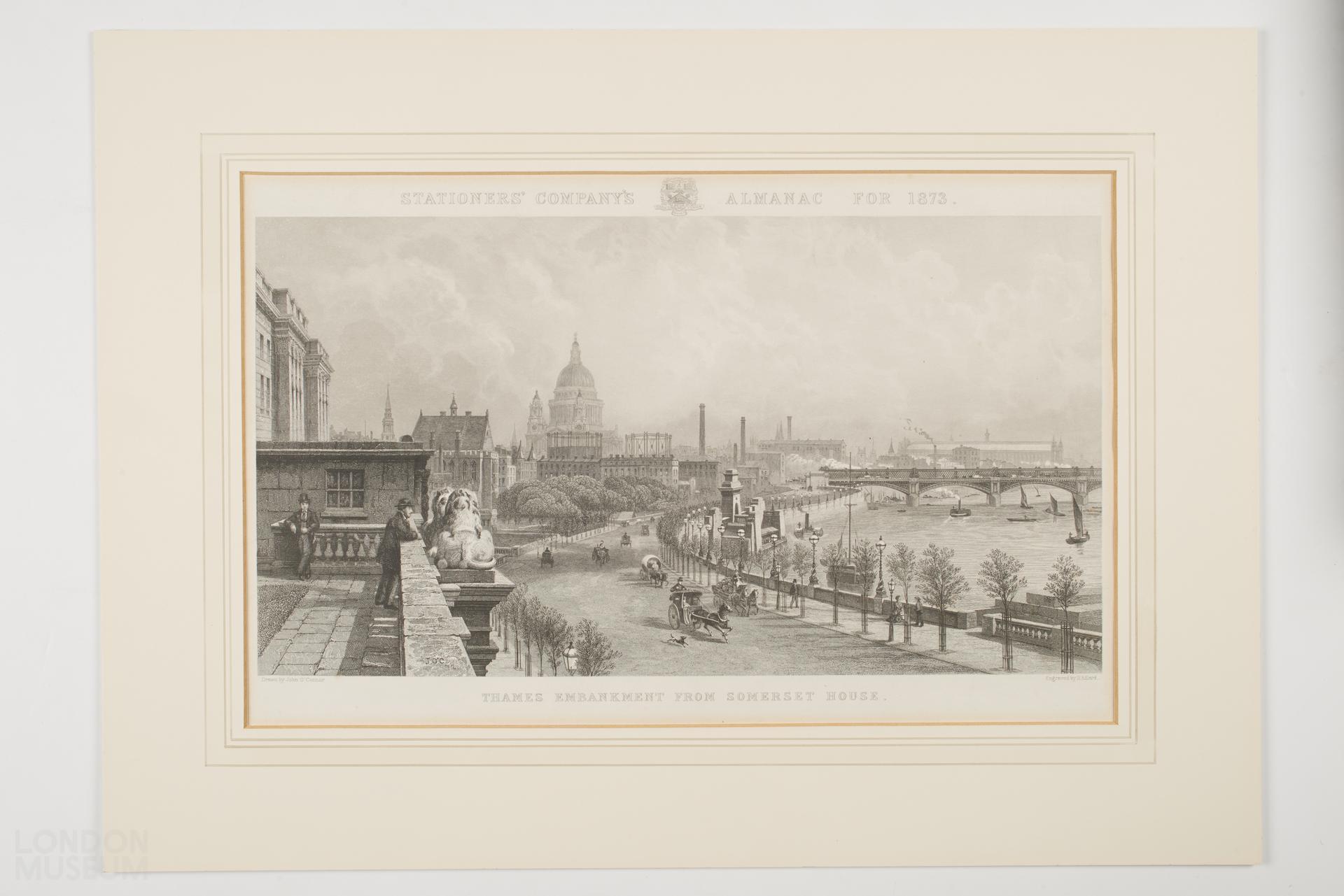 This print is based on the study for the painting of 'The Embankment' by John O'Connor in the Museum of London's collection (85.552). The study was exhibited at the Royal Academy in 1874. There are several differences between this print and 85.552: different figures on the terrace of Somerset House, no soldiers on the embankment and different boats on the water. The print was published in 'The Stationers Almanac', 1873.