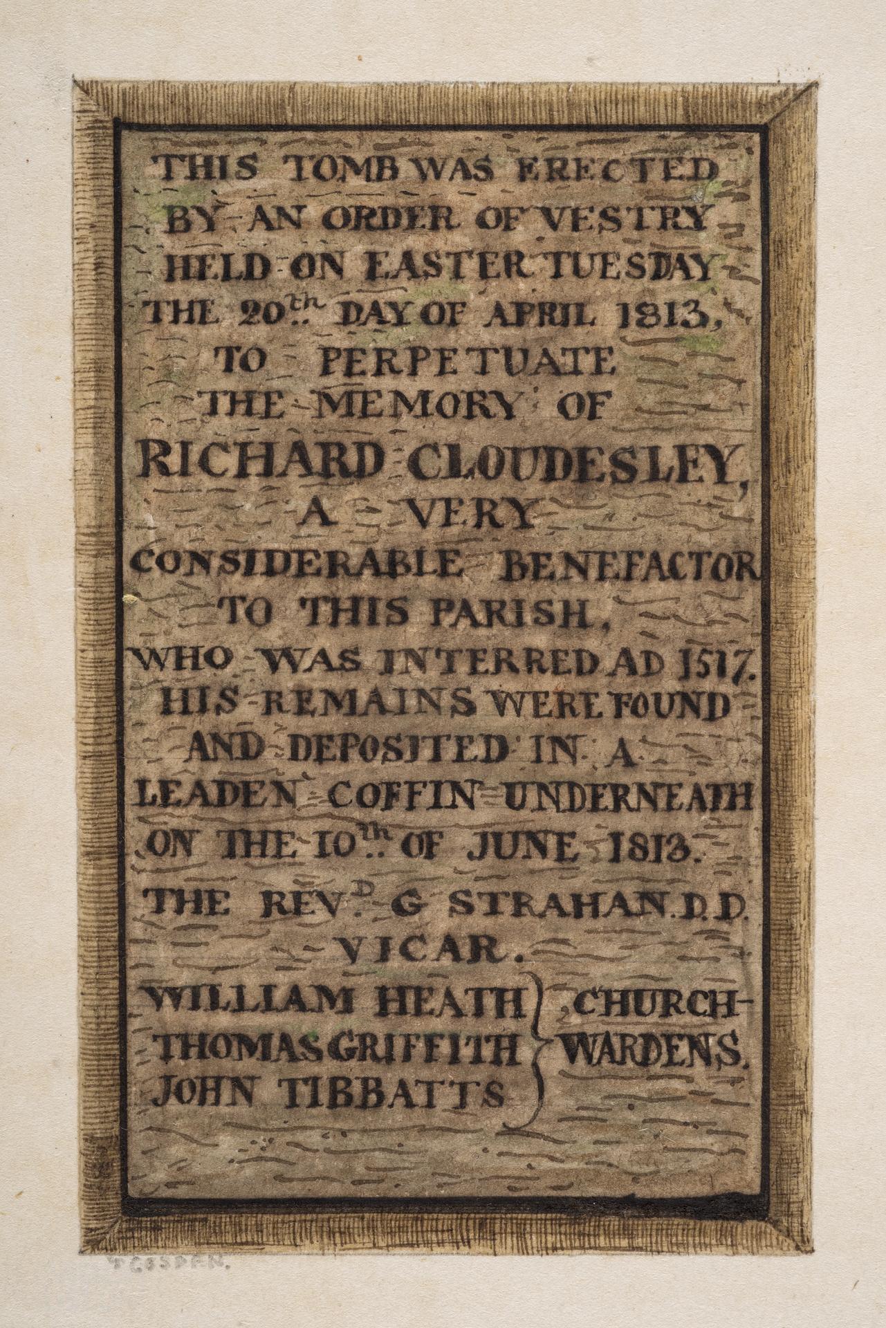 The inscription on Richard Cloudesley’s tomb in the churchyard of St Mary Islington, drawn by Thomas Gosden (1780 – 1843), probably c.1840