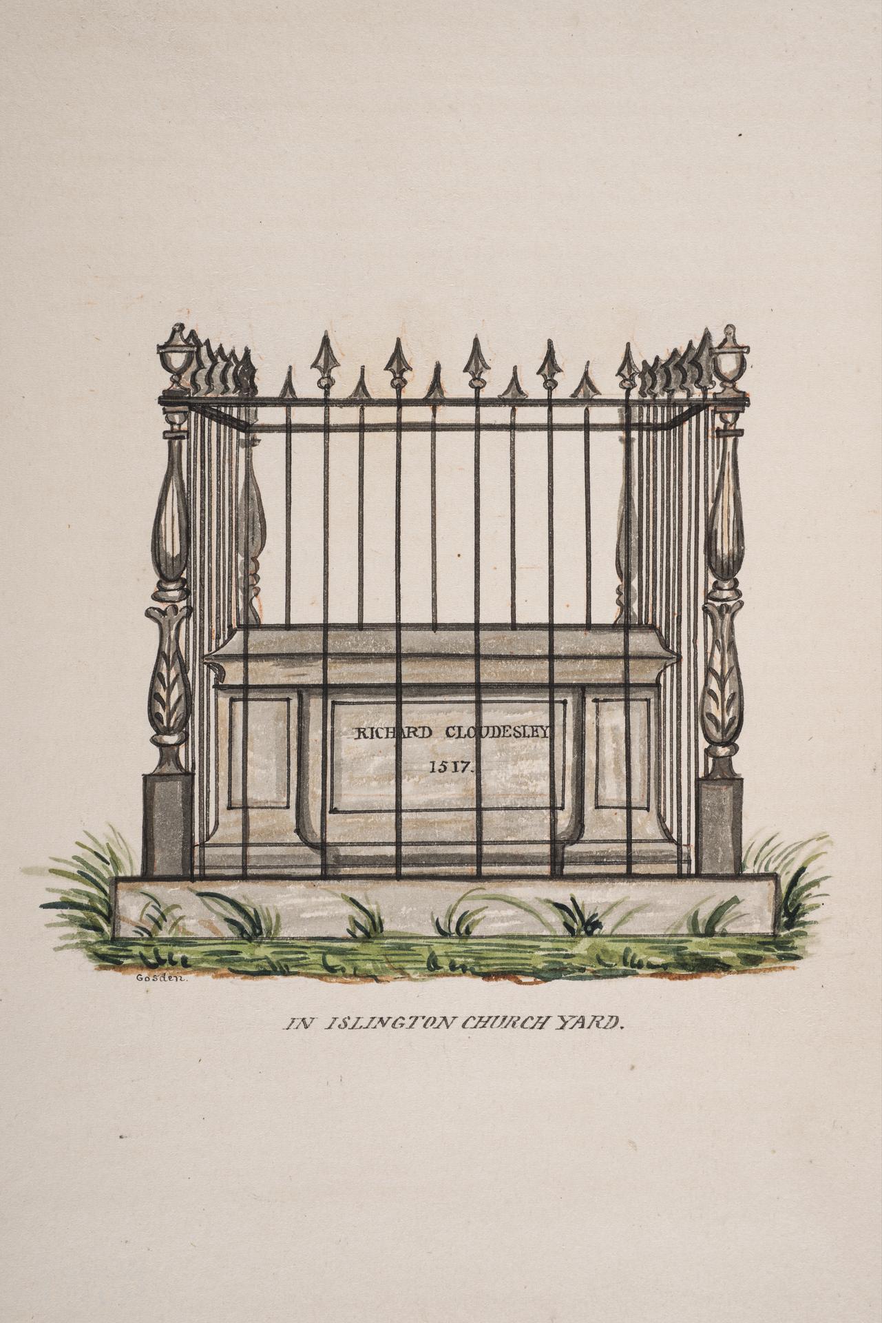 The Tomb of Richard Cloudesley and in the churchyard of St Mary Islington, drawn by Thomas Gosden (1780 – 1843), probably c.1840. Richard Cloudesley d.1517. He was one of Islington’s best known charitable benefactors. His will of 1517 left 2 fields of pasture land ‘the stony fields’ to the parish of St Mary Islington. The annual rent from these fields was initially paid into the churchwardens account and managed through St. Mary’s vestry. In the middle of the 19th century the charity was constituted more formally as the Richard Cloudesley Charity, and in 2013 it rebranded as just ‘Cloudesley’.