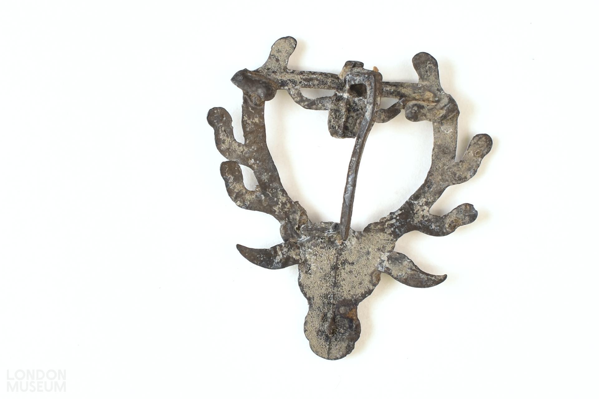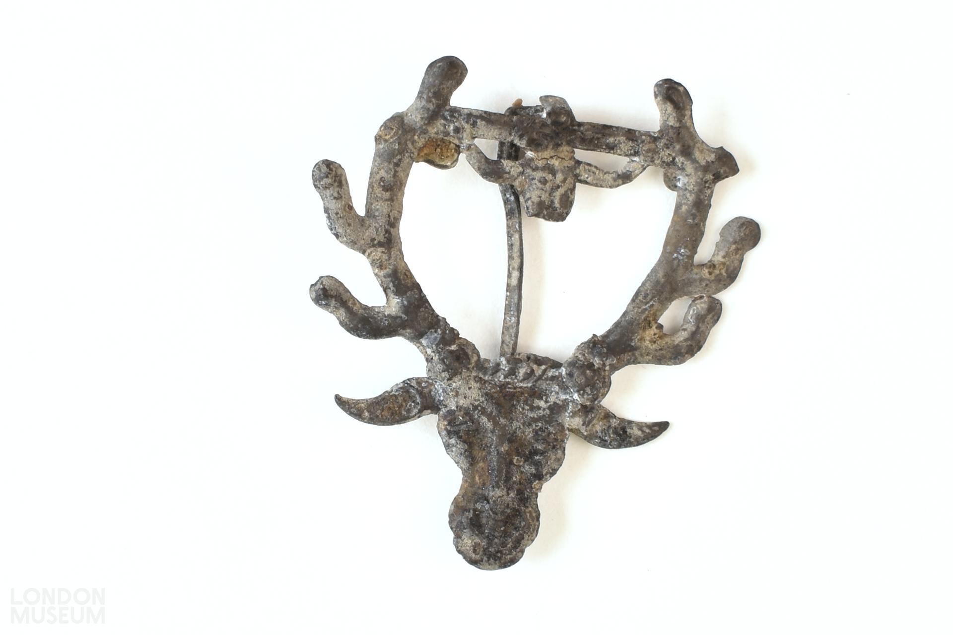 It has proved impossible to find a direct parallel. Richard II’s device of the hart lodged (lying down) make their first appearance at the Smithfield tournament in October 1390, and variant forms of hart badge in pewter are known from 14th and 15th century contexts. Whether this badge was made for a specific individual or as some kind of general souvenir is unknown.