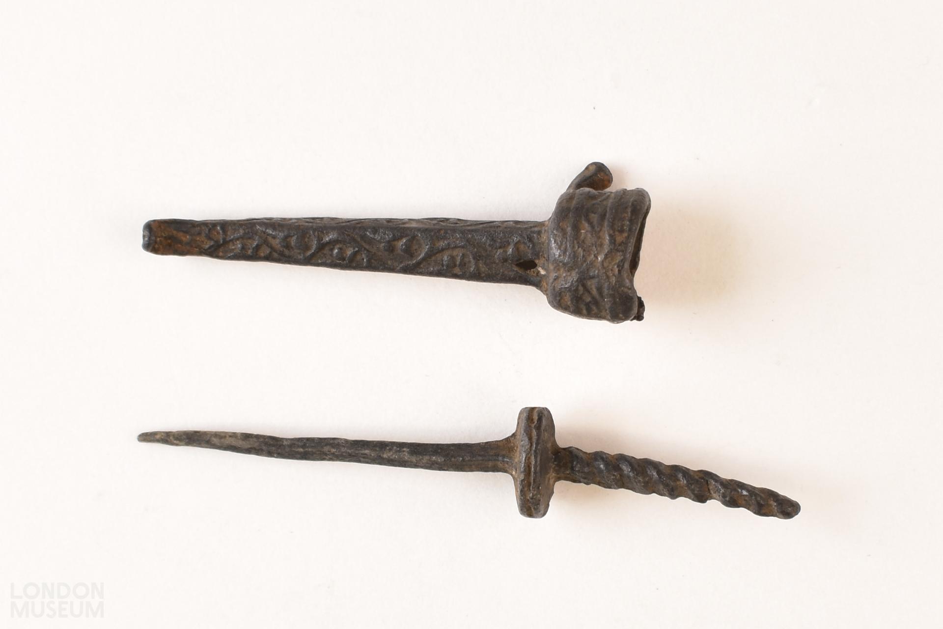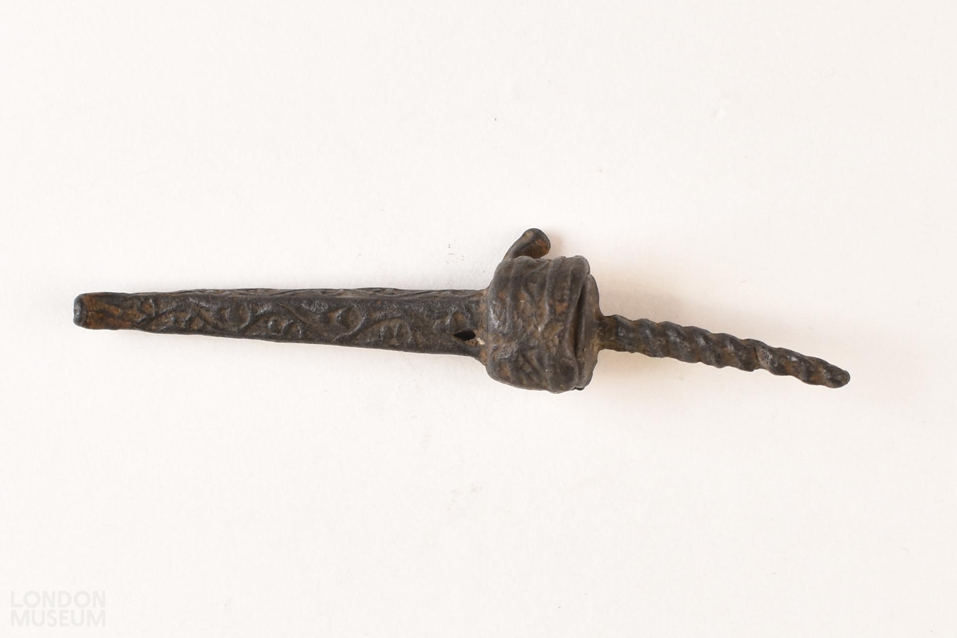 Several examples of miniature daggers and dagger sheaths have been found in England (see Salisbury & South Wiltshire Museum: Medieval Catalogue Spencer, 1990a cat. no. 191-121 figs. 251 and 252); and the Netherlands – see Bergen op Zoom, 1987, p 63 and van Heeringen, Koldeweij and Gallman, 1987, p 62. In only one instance has a miniature pendant dagger-sheath been found with its dagger still inside (see Trig Lane, London, Trans. LAMAS, 32, p 315 – though even here the hilt is missing. So the example described above is of singular importance in being, the most complete example so far known. It has been suggested that these miniature daggers were worn as a badge, perhaps as an adornment for a hat or hoot, with the rectangular loop for suspension or stitching. On stylistic grounds, the sheaf clearly represents cuir bouli leather work; the dagger likewise resembles its full-scale counterpart.
