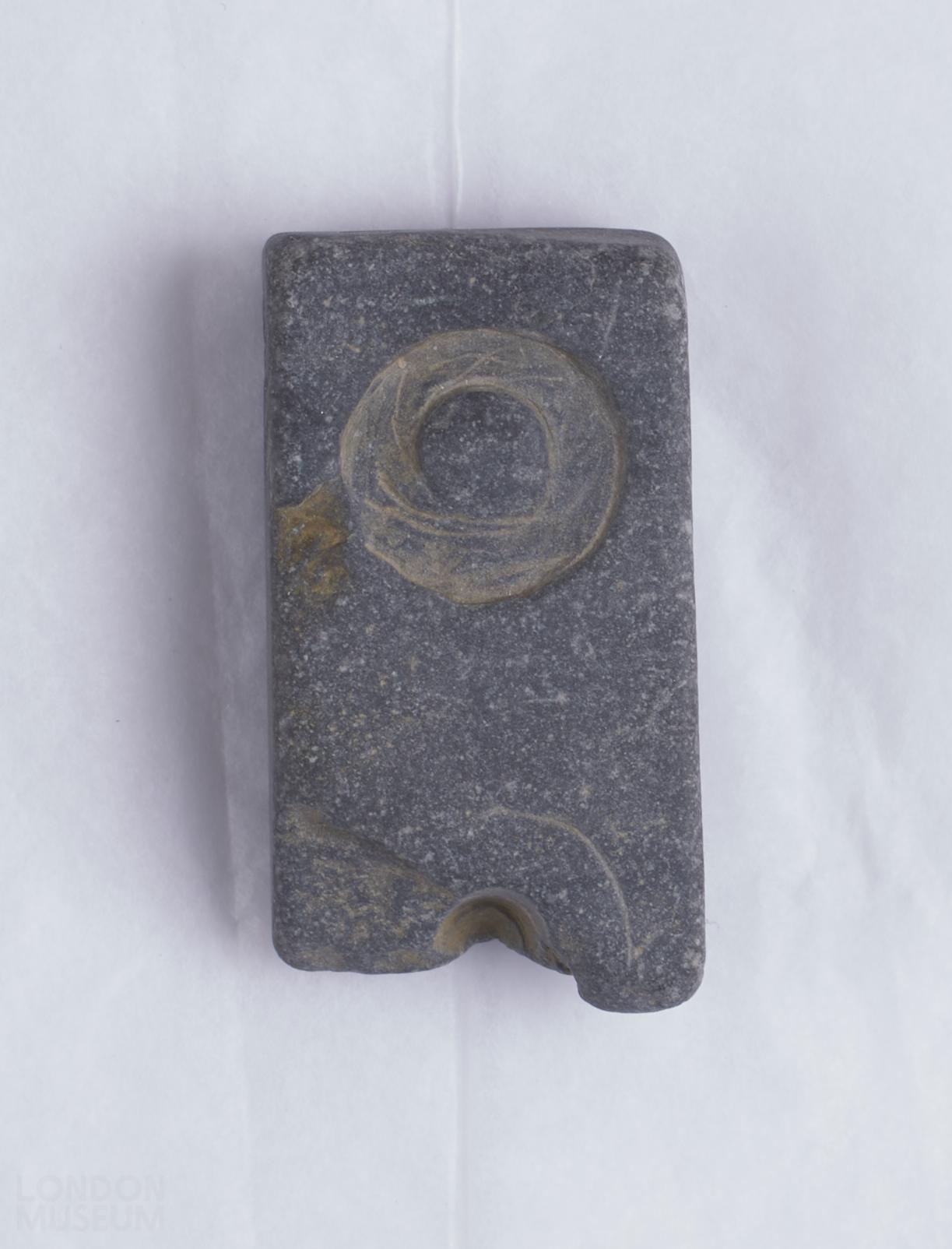 The riveted form of seal, with all its variations, seems to have been devised specifically for marking commercial textiles. These seals were attached to the cloth by folding the disc around each side of the textile so that the rivet on one disc could be pushed through the fabric and the corresponding hole in the other; the rivet was then bent over to secure the two sections together and the seal was stamped with one or two dies (matrices) in the manner of hammered coins, to close it firmly in place and to register the appropriate information – typically the size, weight and quality of the cloth; the name of the dyer or clothier and the place of production. More rarely also, a date. Two-disc seals were the norm to the late 16th century in England. Single rivets were also usual. The matrices used to produce blank cloth seals are a fairly rare objects in Britain. Just six (all copper-based alloys) are recorded in the British Museum catalogue of 1994, and two more in an article of 1995. Another example came to light from Ditcham, East Hampshire in October 2015; also in copper. The Museum of London has the most complete stone example; acc. no. 81.234 from the Thames foreshore at Custom House, but this new piece is important because it is incomplete and of a rather different type. The proximity of the find spot to the location of Blackwell Hall, London’s central cloth market, is also significant. Cloth seals provide crucial evidence for the textile economy of London and London’s trading interests in Europe and around the globe.