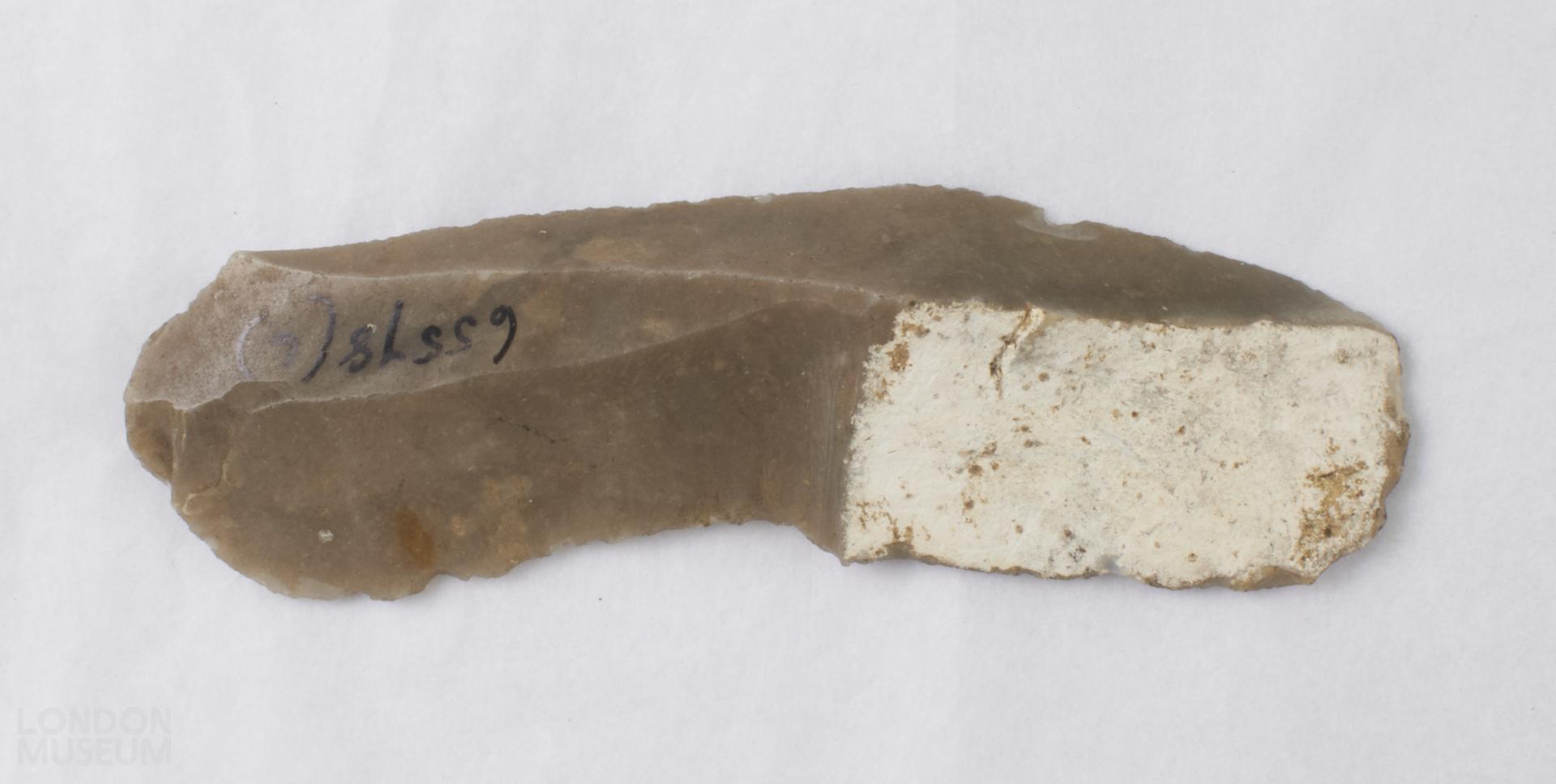 Worked flake of grey flint with very white cortex at distal end. Marked 'Thames'.