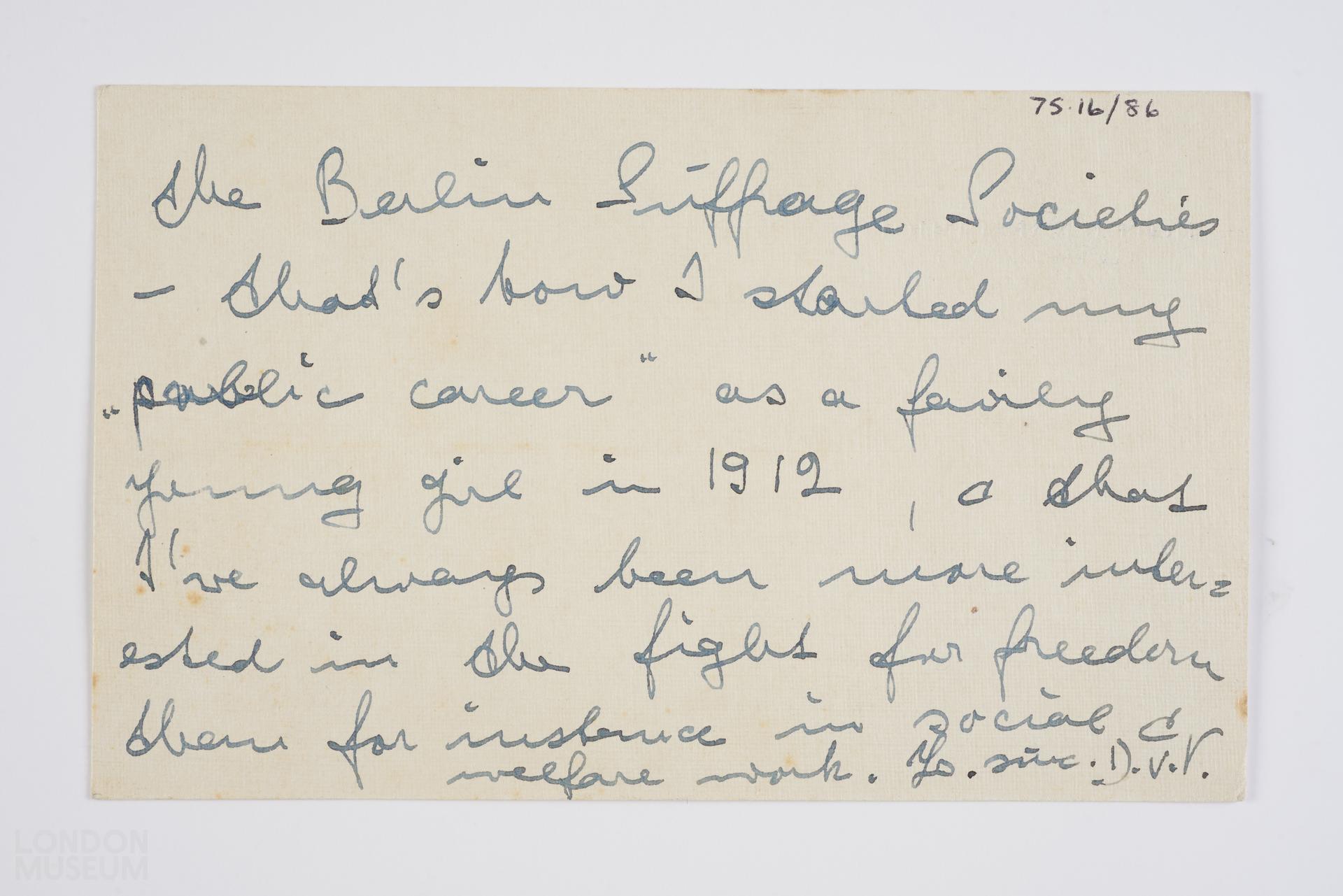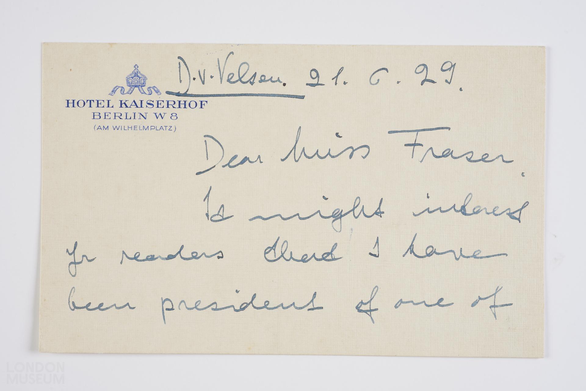 Letter from a collection of at least 122 letters, press cuttings, articles by and relating to Helen Fraser. Letter written on headed card from Hotel Kaiserhof, Berlin, and the signature is possibly D. V. Velseu. The author writes: "Dear Miss Fraser, It may interest your readers [?] that I have been President of one of the Berlin Suffrage Societies- that's how I started my "public career" as a fairly young girl in 1912, a [?] I've always been [?] in the fight for freedom then for injustice[?] in social and welfare work".