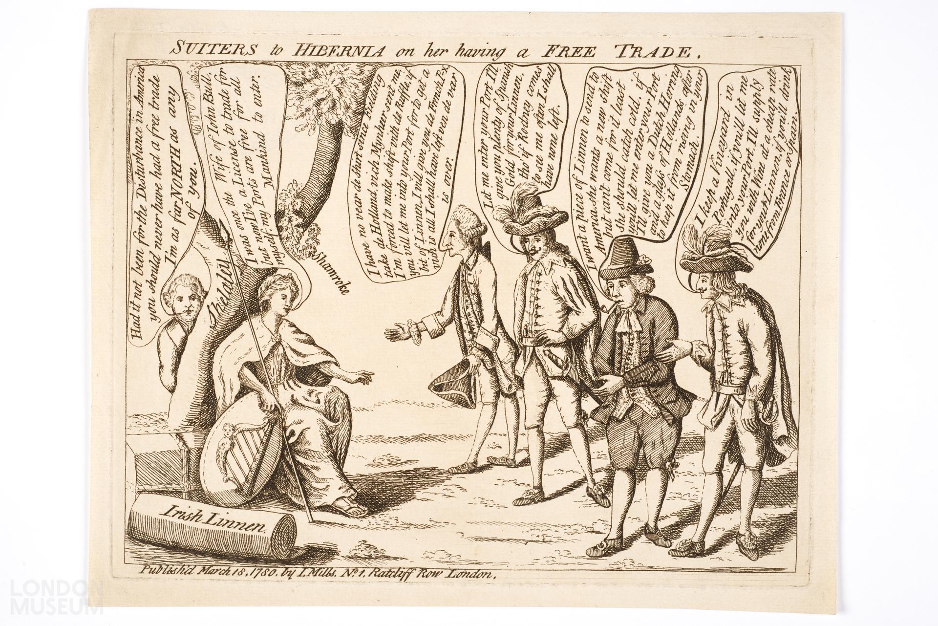 'Suiters to Hibernia on her having a free trade'. France, Spain, Holland and Portugal court Ireland for its trade in linen when restrictions on trade were lifted, partly as a result of the American war. Lord North complains, hiding behind Hibernia's throne. BM Satire catalogue no. 5653.