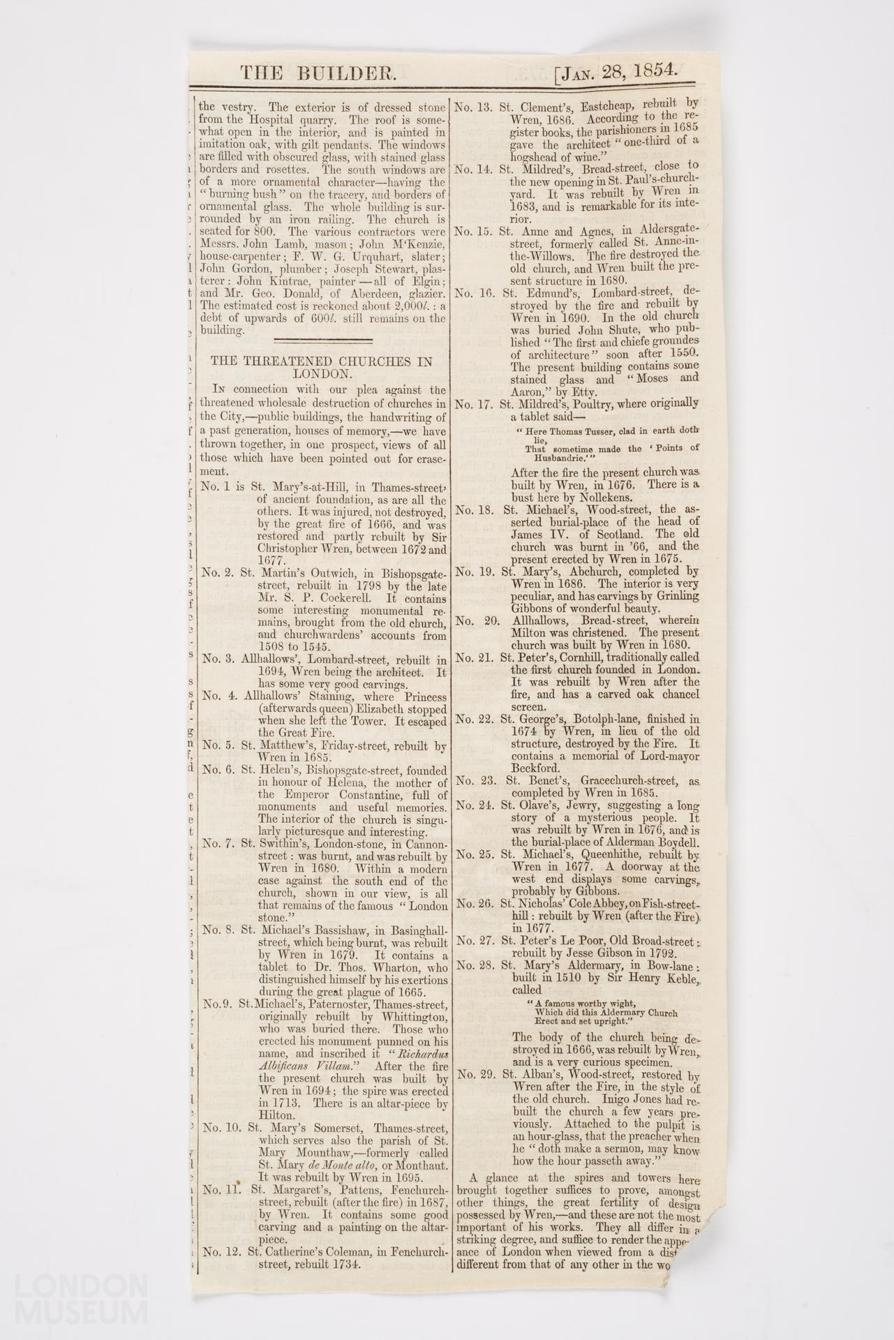 One of 6 pages with text and prints from The Builder, from various editions of 1854. From Vol XII-No 588, with text describing various churches of London (accompanies 2014.45/483d).