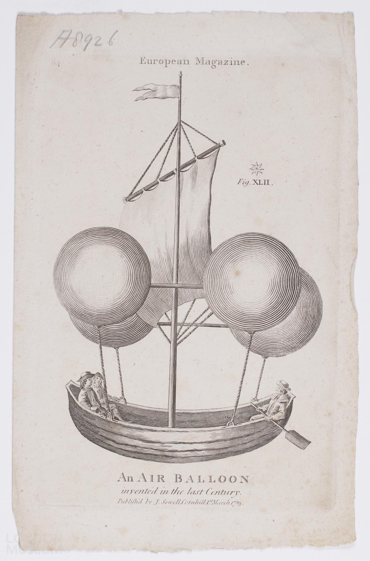 A close up view of 'an Air Balloon, invented in the last century', with a sail and three passengers, one holding an oar.