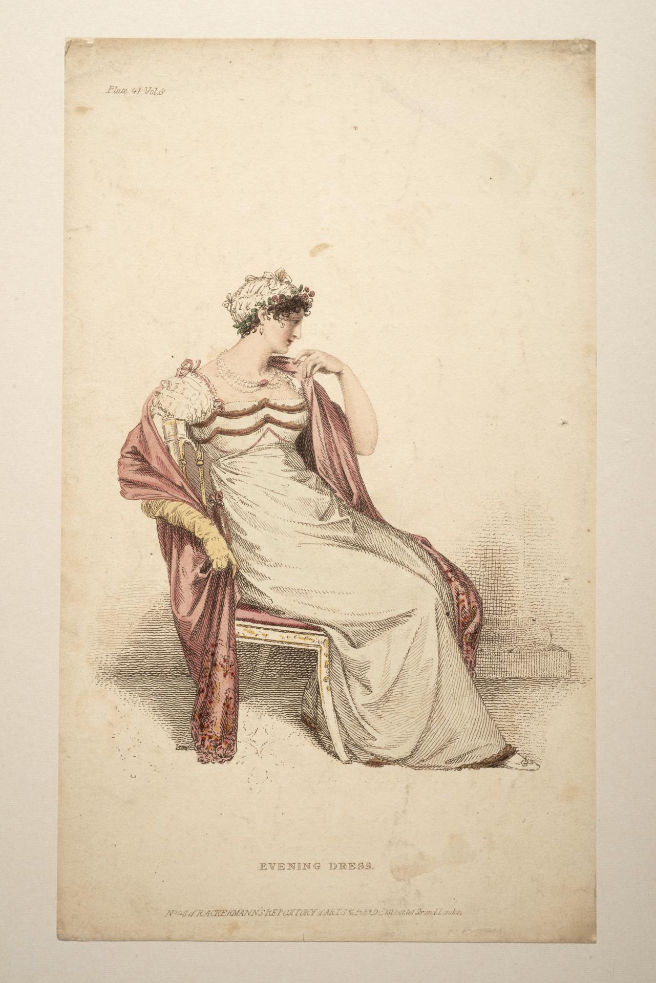 Fashion plate depicting an individual sitting on a chair, wearing a white empire waist evening dress, and a white bonnet, trimmed with pink flowers. The individual also wears a pink shawl, white shoes, and one long yellow glove. Entitled, 'Evening Dress'. Subtitled, 'No. 48 of R Ackermann's Repository of Arts & C. Pub. 1 Decr 1812 at 101 Strand, London'. Plate 41. Vol. 8'.