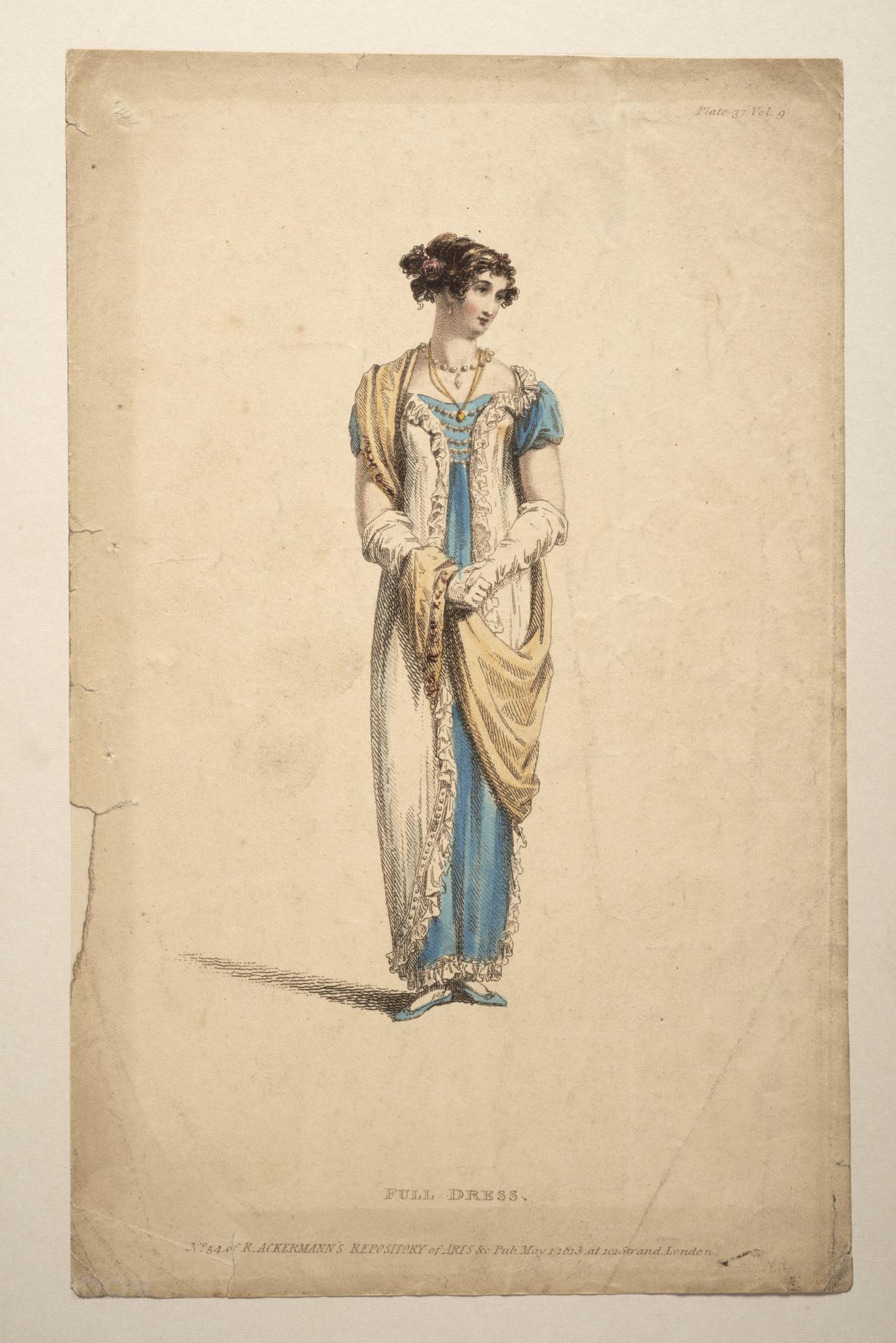 Titled: 'Full Dress. No. 54 of R Ackermann's Repository of Arts & C. Pub. May 1 1813, at 101 Strand, London'. Plate 37. Vol 9.