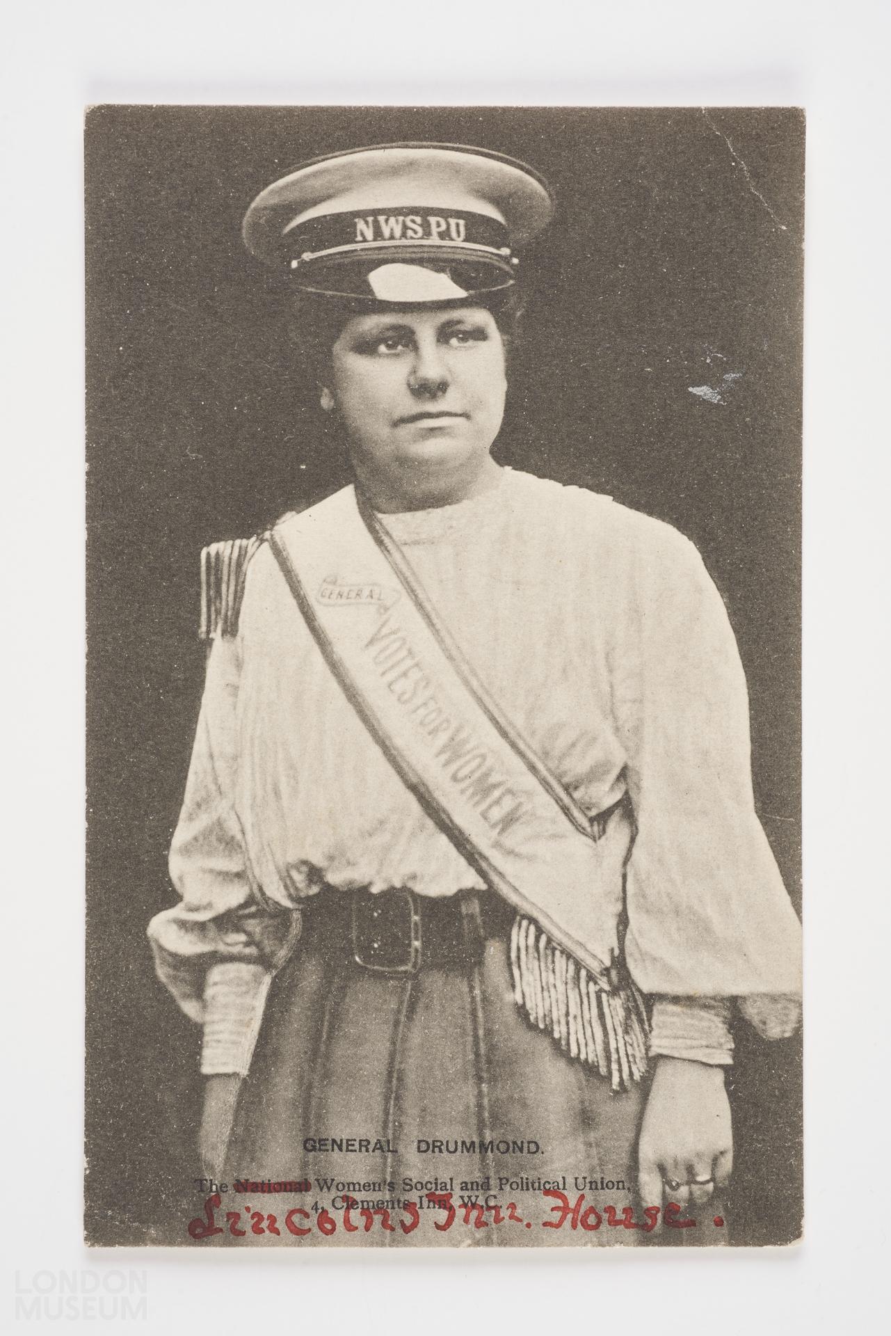 Postcard with photographic portrait of Flora Drummond (1879-1949). Beneath is printed 'General Drummond, The National Women's Social and Political Union' and the address of the organisation. The 'National' has been crossed out in red pen and 'Lizz Ca[illegible]' handwritten below. Flora Drummond was one of the original members of the WSPU. In 1906 she moved with the Pankhursts from Manchester to London and became a paid organiser for the campaign. She was imprisoned 9 times for her suffragette activities, once serving three weeks for chaining herself to the railings of 10 Downing Street. Nickamed the 'General' by her fellow suffragettes, Drummond was a keen horsewoman and enjoyed heading WSPU processions dressed in a peaked cap and epaulettes. The photograph was taken by Lizzie Caswall Smith, a photographer who made a number of suffragette portraits.