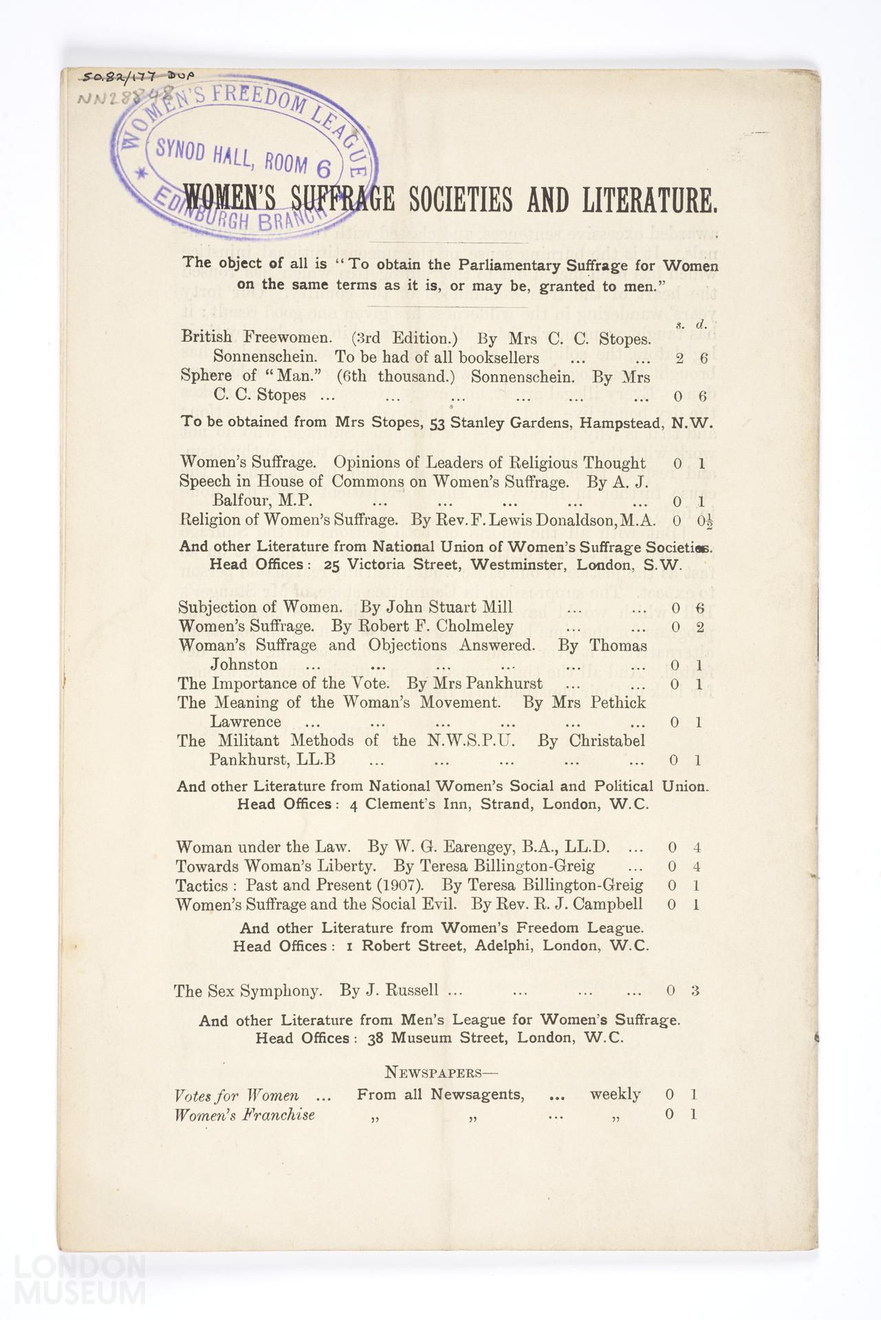 Pamphlet titled 'The constitutional basis of women's suffrage', by Mrs. C.C. Stopes; reprinted from the 'Fortnightly Review', September 1908. Stopes outlines the case for electoral reform and supports the use of milittant methods in the pursuit of women's enfranchisement. Women's Freedom League stamp on the back. Part of the collection of objects relating to the Suffragette Movement, given by the Suffragette Fellowship, 1950.