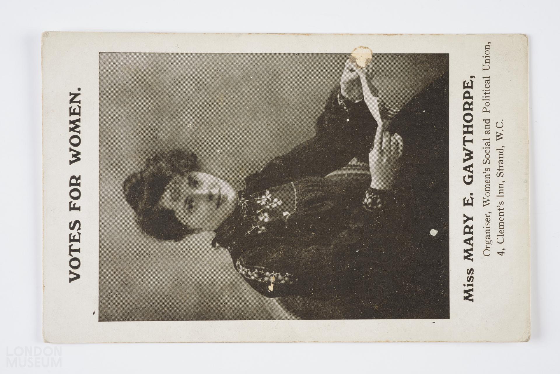 Postcard portrait of Mary E. Gawthorpe, Organiser for the Women's Social and Political Union. Such postcards were issued by the Women's Social and Political Union to raise the profile of the leaders throughout the country as well as for raising funds.