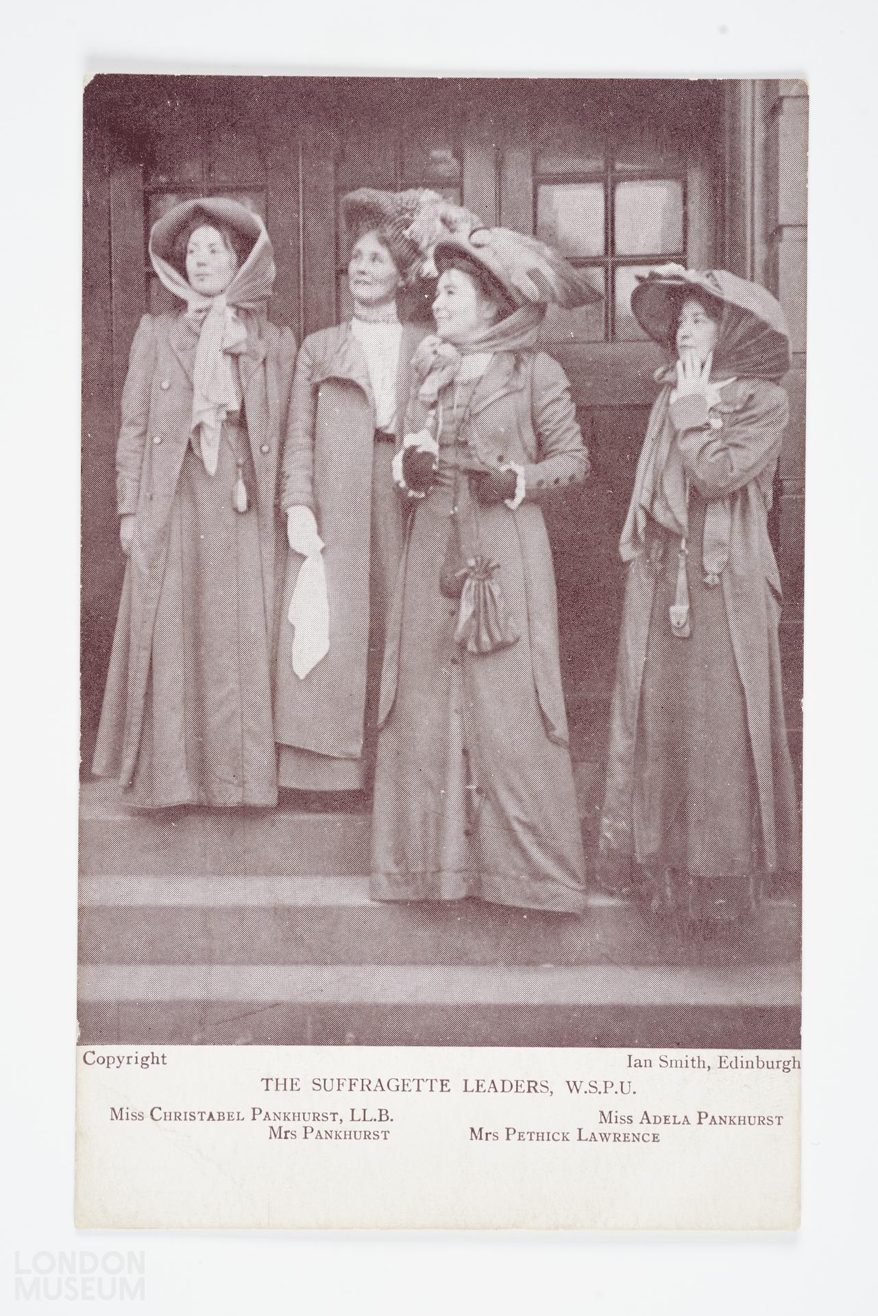 Postcard with photograph captioned 'The Suffragette leaders, W.S.P.U., Miss Christabel Pankhurst, L.L.B., Miss Adela Pankhurst, Mrs Pankhurst, Mrs Pethick Lawrence'. The women stand on steps looking to the left.