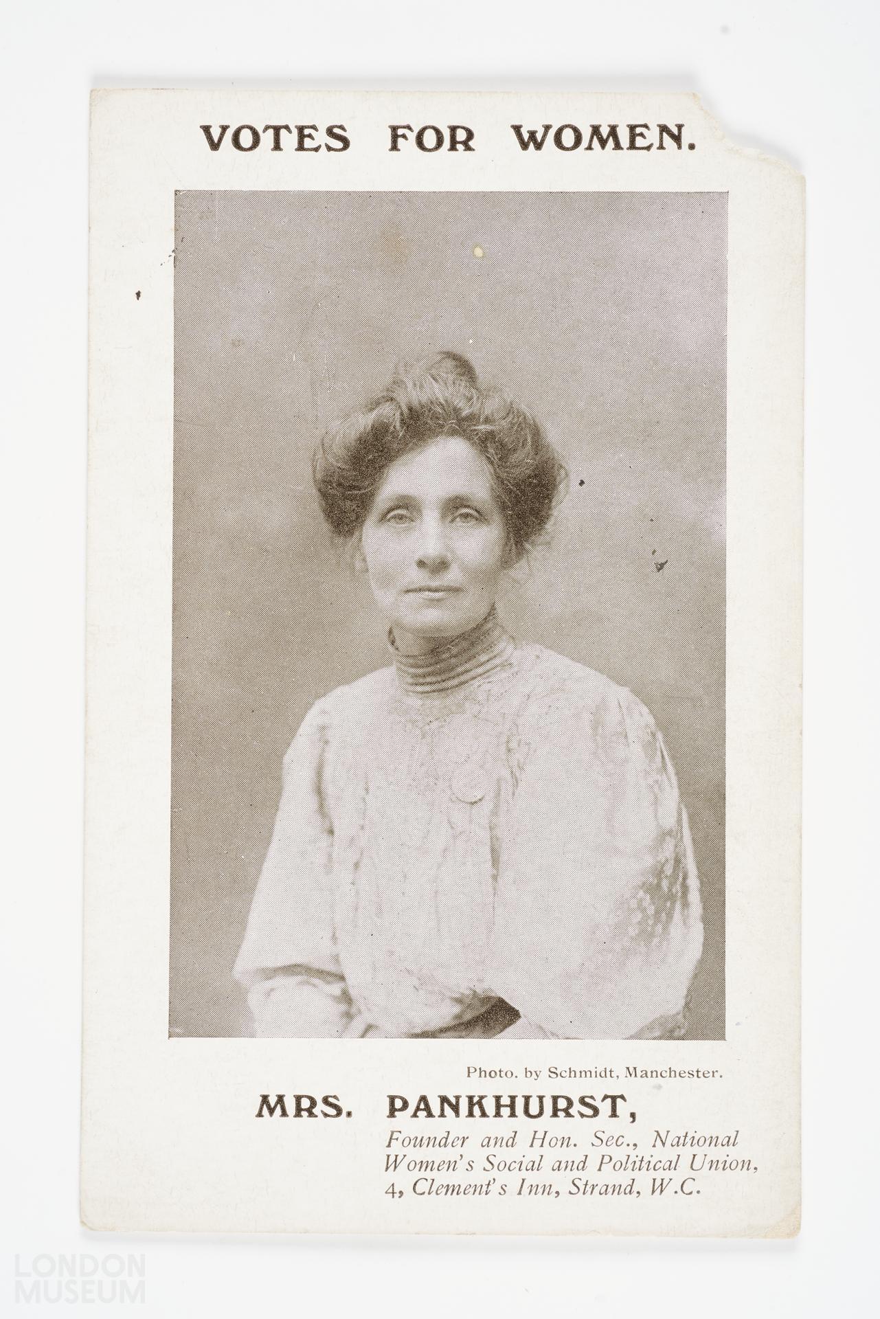 Postcard with photographic portrait of Emmeline Pankhurst (1858-1928), Above is printed 'Votes For Women'. Below is 'Mrs. Pankhurst, Founder and Hon. Sec., National Women's Social and Political Union' and the organisation's address.