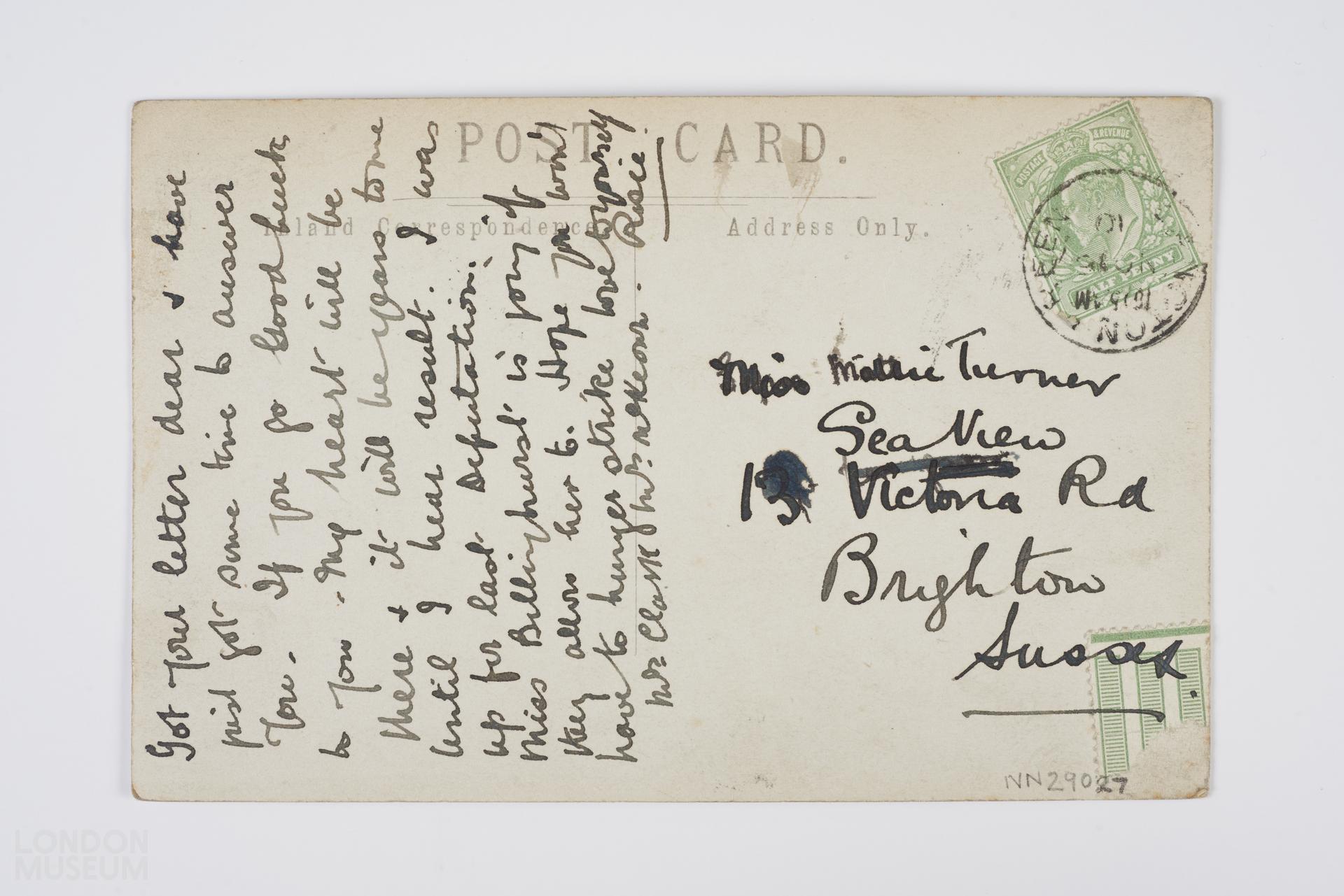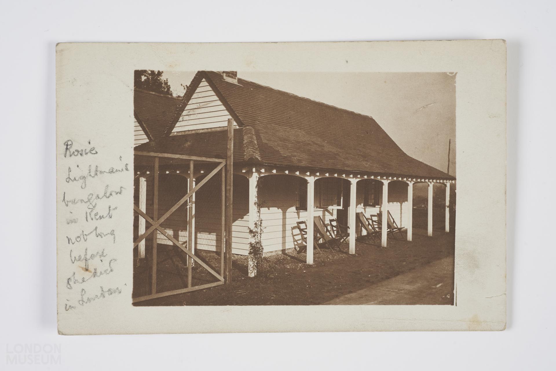 Photographic postcard of a bungalow, handwritten in pencil to the left hand side, 'Rosie Lightman's bungalow in Kent not long before she died in London'. On the reverse is a letter addressed to Miss [illegible] Turner, 'Got your letter dear and have just got some time to answer you. If you go good luck to you - my heart will be there + it will be years to me until I hear result. I was up for last deputation. Miss Billinghurst is going if they allow her to. Hope you wont have to hunger strike - love to youself [illegible possibly Rosie]. Mrs Clark Mrs [illegible possible McKeon]'.