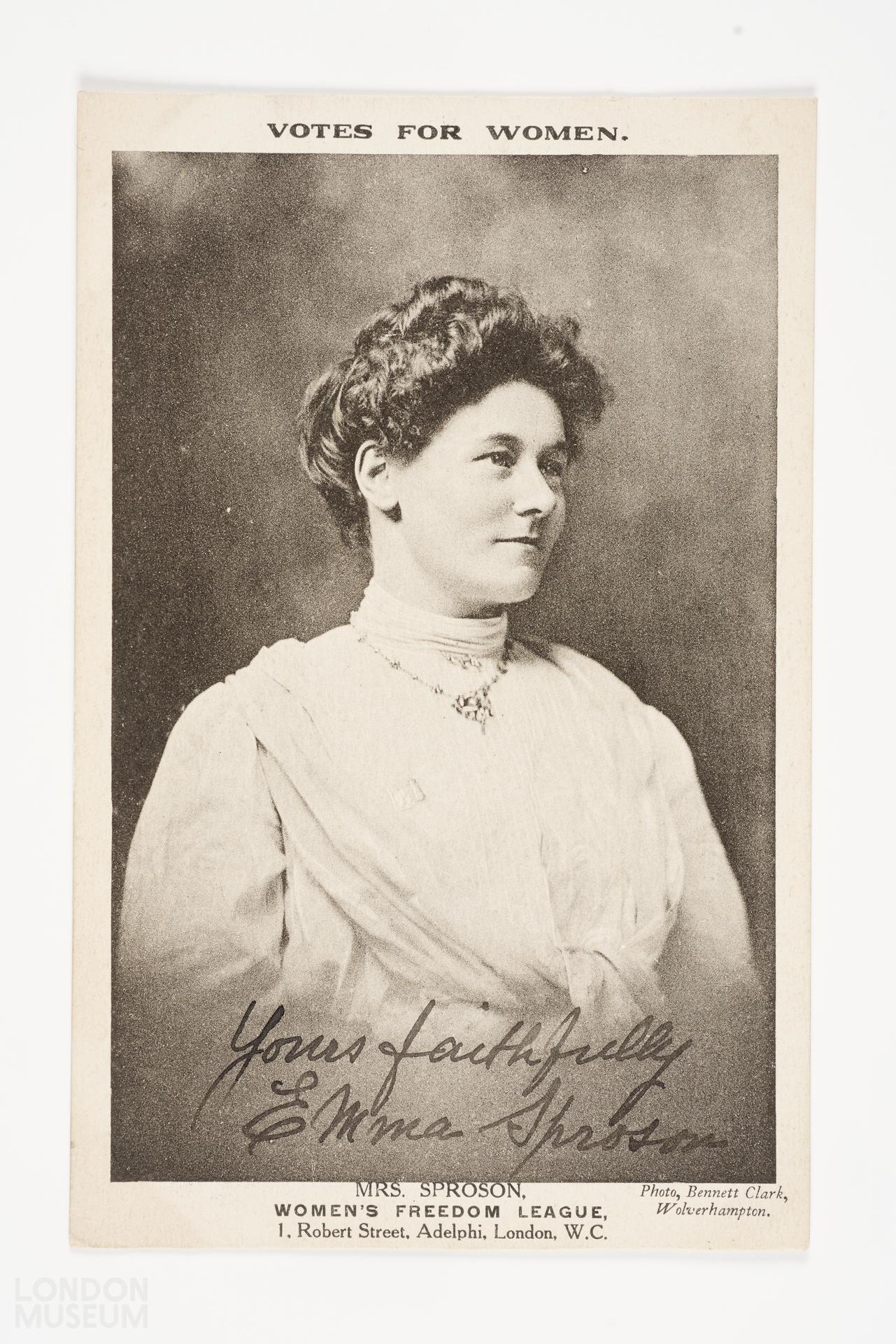Postcard with photographic portrait beneath which is printed 'Mrs Sproson. Women's Freedom League' and the organisation's address. Above is 'Votes For Women'.