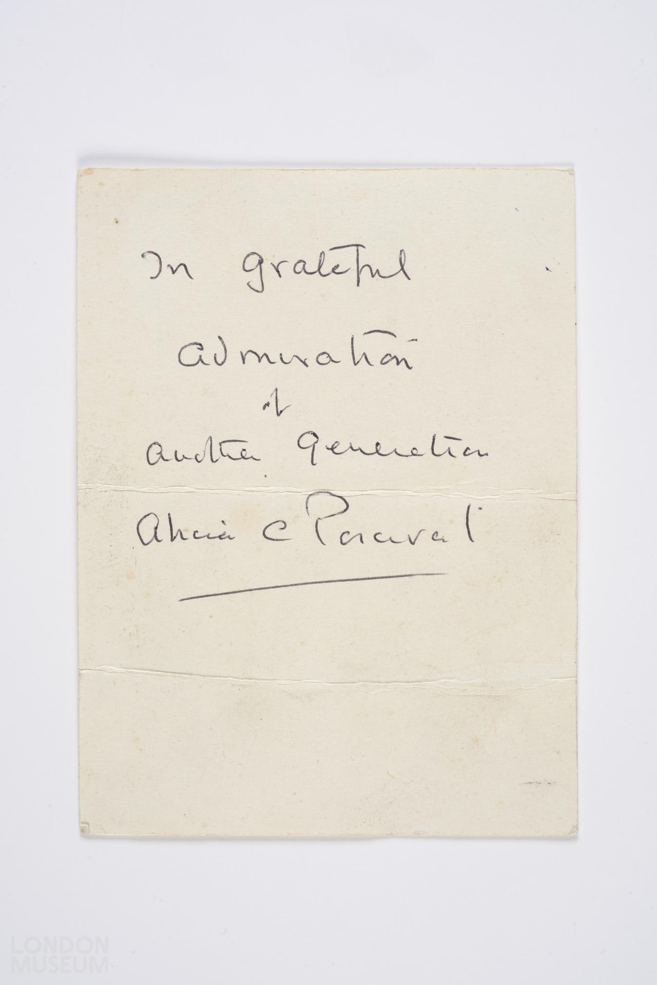 One of nine bouquet cards. The card is a University of London Senate House Refectory Permit which has been re-used as a bouquet card. The handwritten side reads: "In grateful admiration of another generation Alicia C. Percival". Each card accompanied a wreath or bouquet of flowers laid at the statue of Mrs Pankhurst in Tower Gardens on the anniversary of her birthday on 14th July in the Diamond Jubiliee year of the WSPU, being 1965.