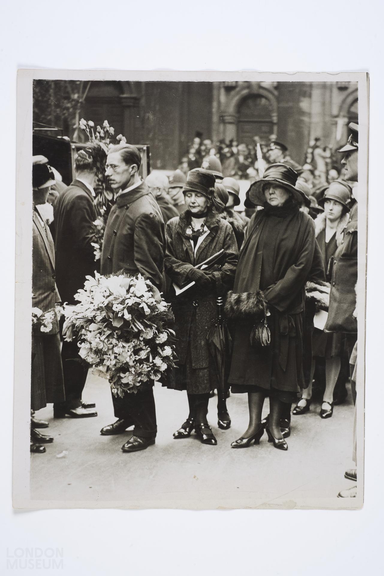 Photograph taken at Emmeline Pankhurst's funeral, showing Mrs Bach and Sylvia Pankhurst standing next to a man who is holding a large bouquet of flowers. On the reverse a printed caption gives more information about the funeral and the people in the photo.