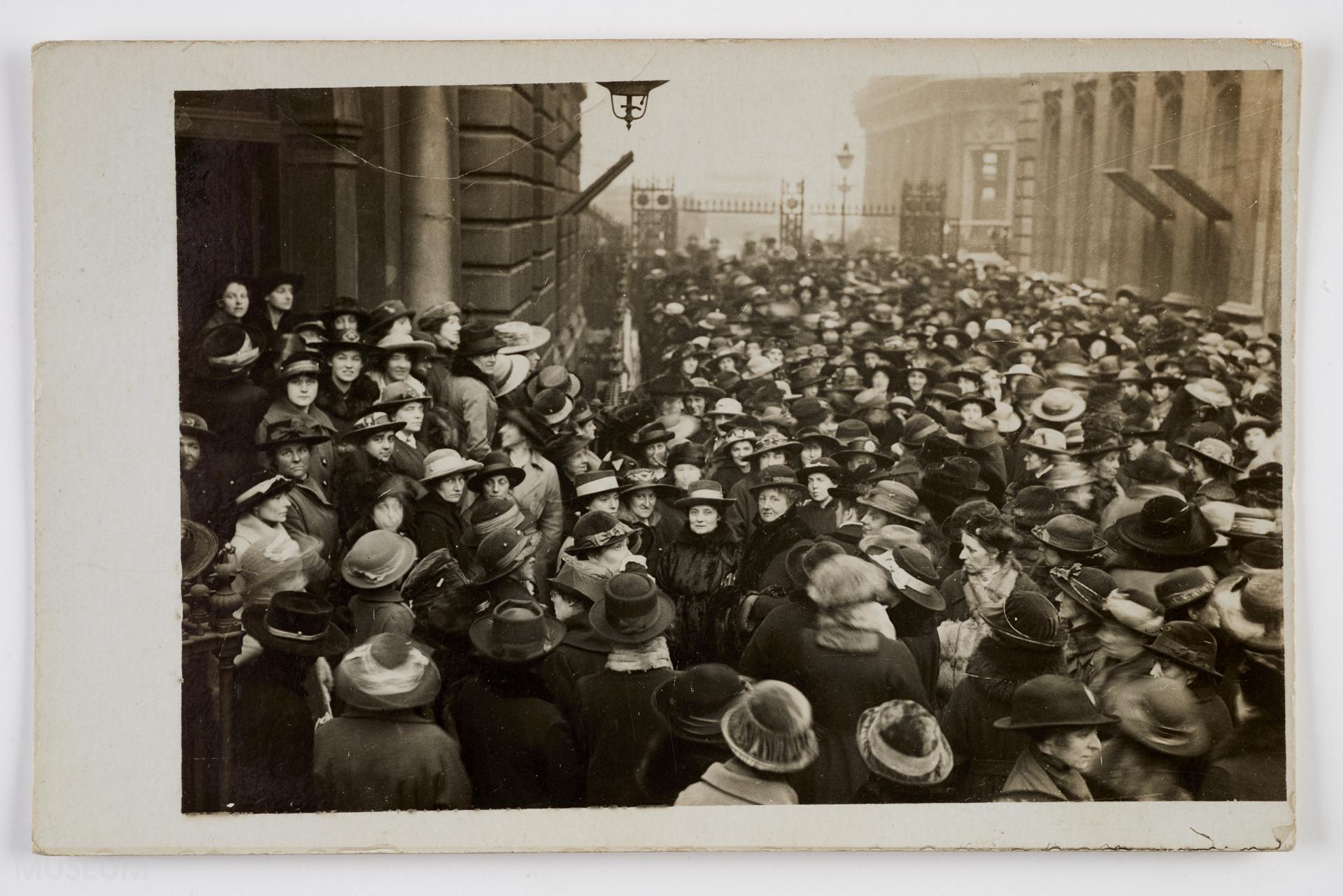 Postcard with photograph of a demonstration linked to the women's suffrage campaign. The crowd is made up of women. Teaching was one of the professions open to women at this period, and many suffragettes worked as teachers.
