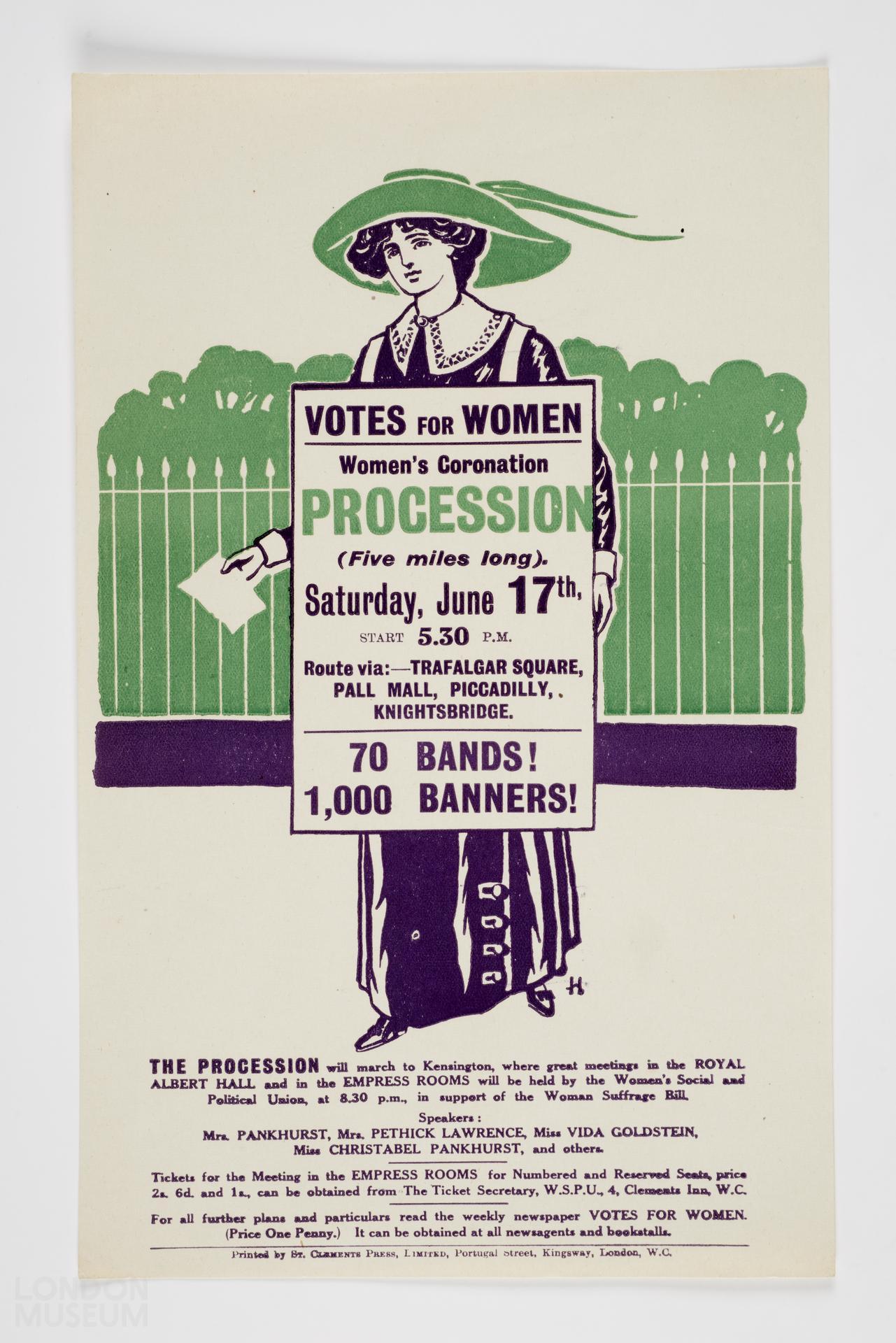 Notice for a Votes for Women, Women's Coronation Procession, (five miles long), Saturday June 17th start 5.30 pm Route via, Trafalgar Square, Pall Mall, Piccadilily, Knightsbridge, 70 bands, 1,000 banners. Speakers Mrs Pankhurst, Mrs Pethick Lawrence, Miss Vida Goldstein, Miss Christabel Pankhurst and others.