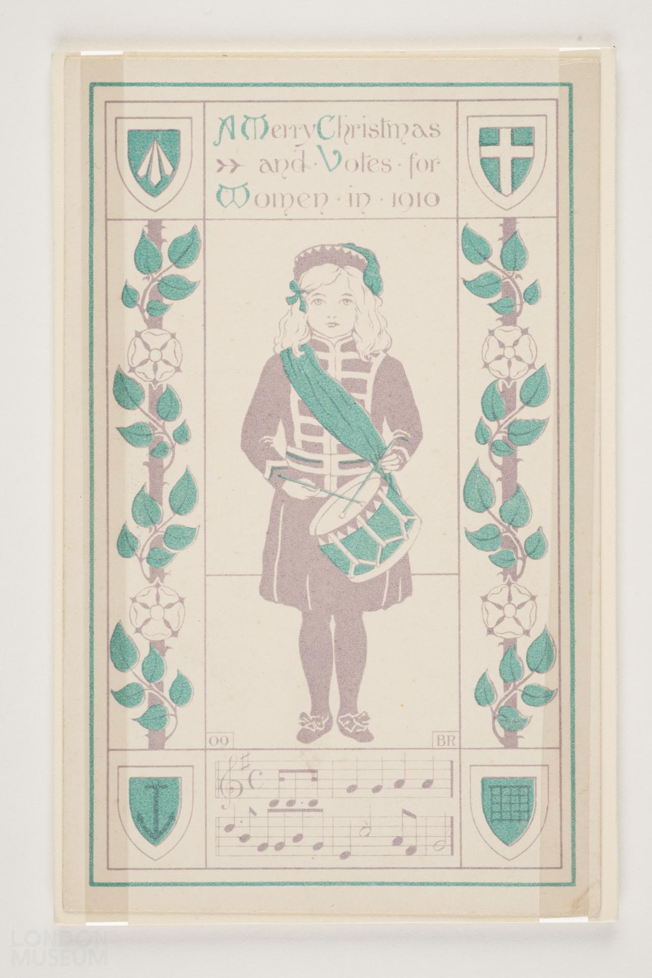 Christmas card issued by the Women's Social and Political Union for 1909. Printed in the suffragette colours of purple, white and green the card depicts a drummer from the WSPU's own junior band, formed, along with the Women's Band in 1909. The greeting on the card optimistically calls for Votes for Women in 1910 referring to the anticipated passing of the Conciliation Bill.