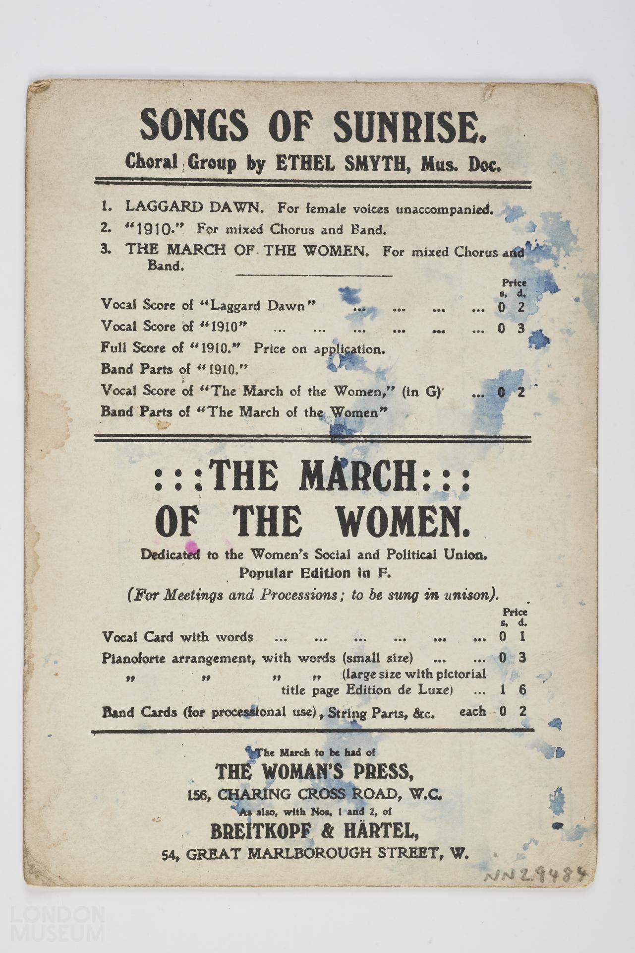Music score for 'The March of the Women' dedicated to the Women's Social and Political Union. Composed by Ethel Smyth 1911. Printed on one side of band or vocal card for marching band procession. This section is 'No.3 1st & 2nd Clarionet in Bb'. On the reverse of the card are printed advertisements for other vocal cards. (Propagandist Songs and Poems).