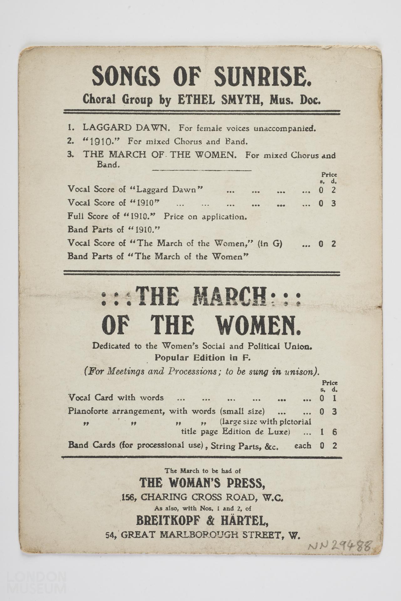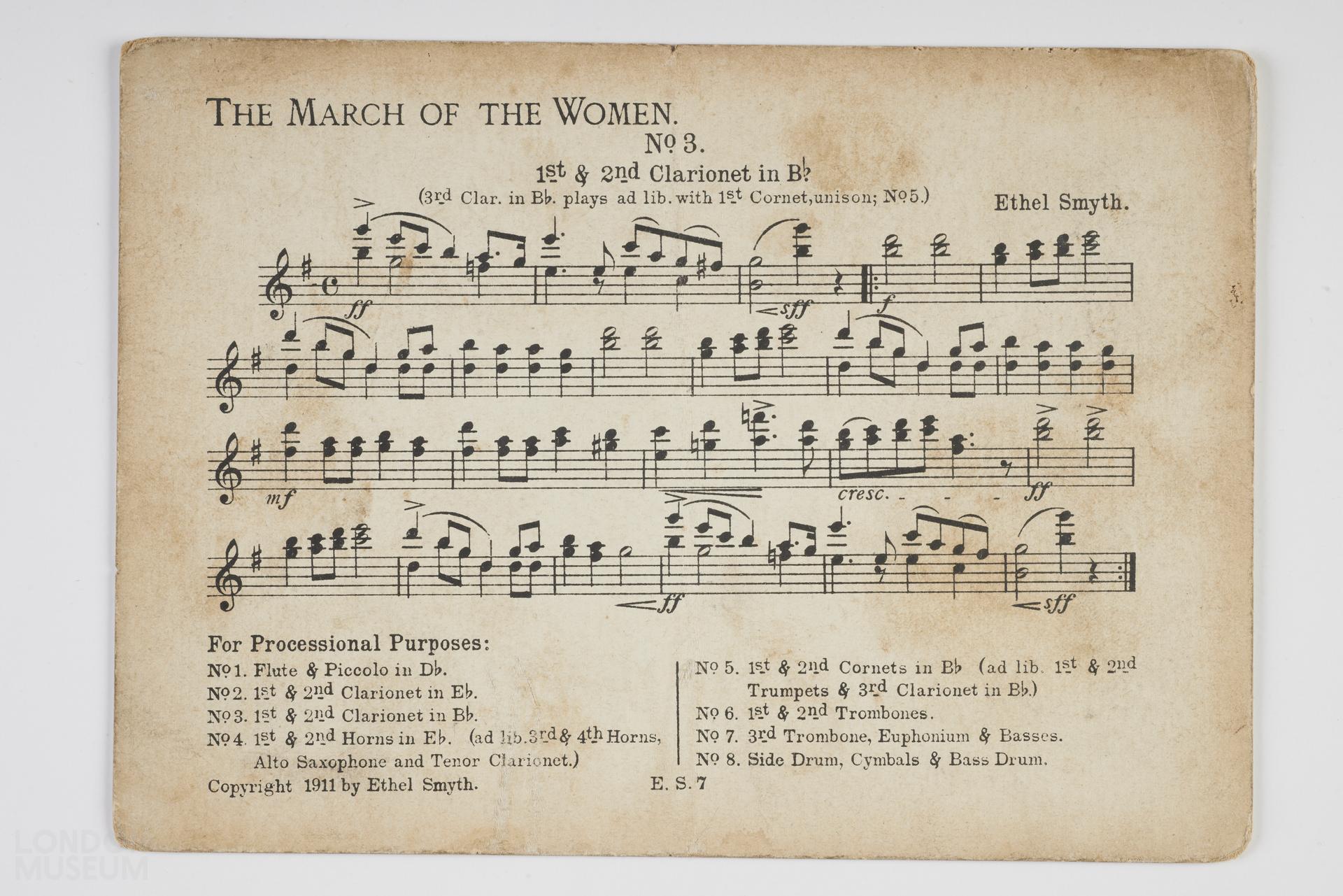 Music score for 'The March of the Women' dedicated to the Women's Social and Political Union. Composed by Ethel Smyth 1911. Printed on one side of band or vocal card for marching band procession. This section is 'No.3 1st & 2nd Clarionet in Bb'. On the reverse of the card are printed advertisements for other vocal cards. (Propagandist Songs and Poems).