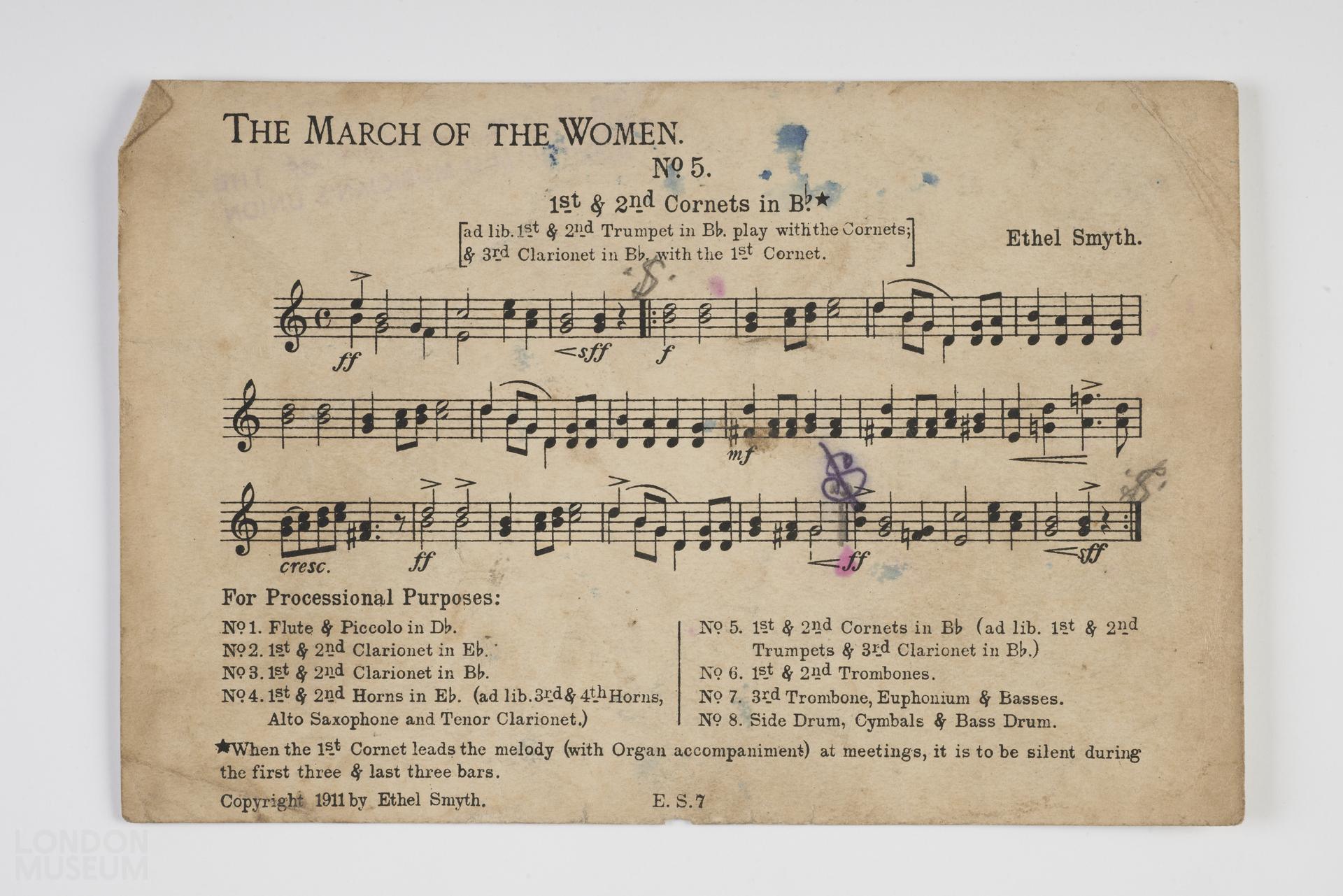 Music score for 'The March of the Women' dedicated to the Women's Social and Political Union. Composed by Ethel Smyth 1911. Printed on one side of band or vocal paper for marching band procession. This section is 'No.5 1st & 2nd Cornets in Bb*'. (Propagandist Songs and Poems).
