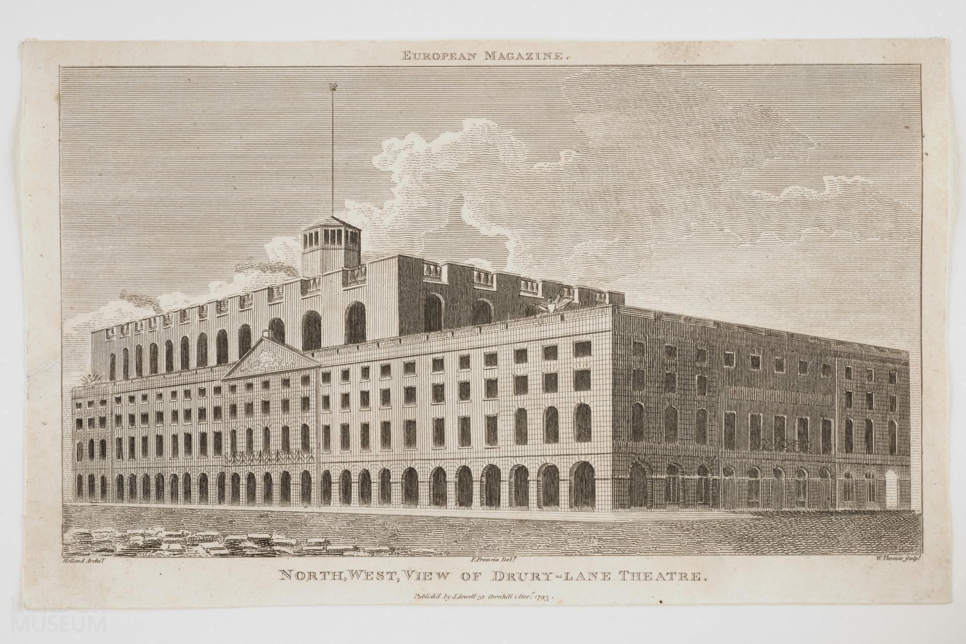 NW view of the Theatre Royal in Drury Lane after rebuilding (architect: Henry Holland). This theatre was burnt down in 1809, to the ruin of Sheridan. From the European Magazine.