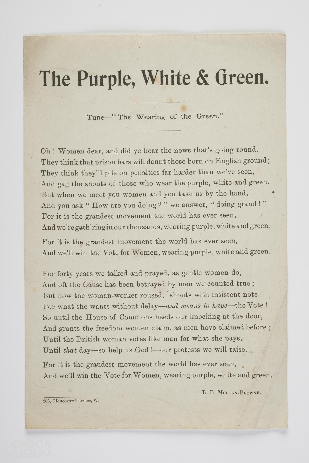 Songsheet printed with the words of the suffragette marching song 'The Purple, White and Green' by L.E. Morgan-Browne. (Propagandist Songs and Poems). Part of the collection of objects relating to the Suffragette Movement, given by the Suffragette Fellowship, 1950.