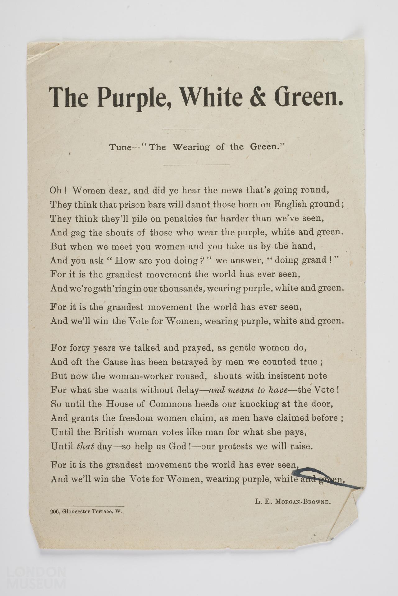 Songsheet printed with the words of the suffragette marching song 'The Purple, White and Green' by L.E. Morgan-Browne. (Propagandist Songs and Poems). Part of the collection of objects relating to the Suffragette Movement, given by the Suffragette Fellowship, 1950.