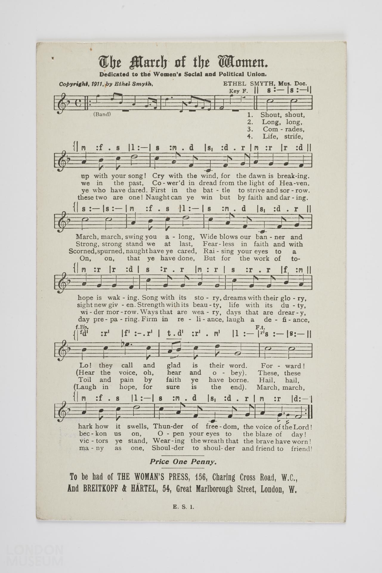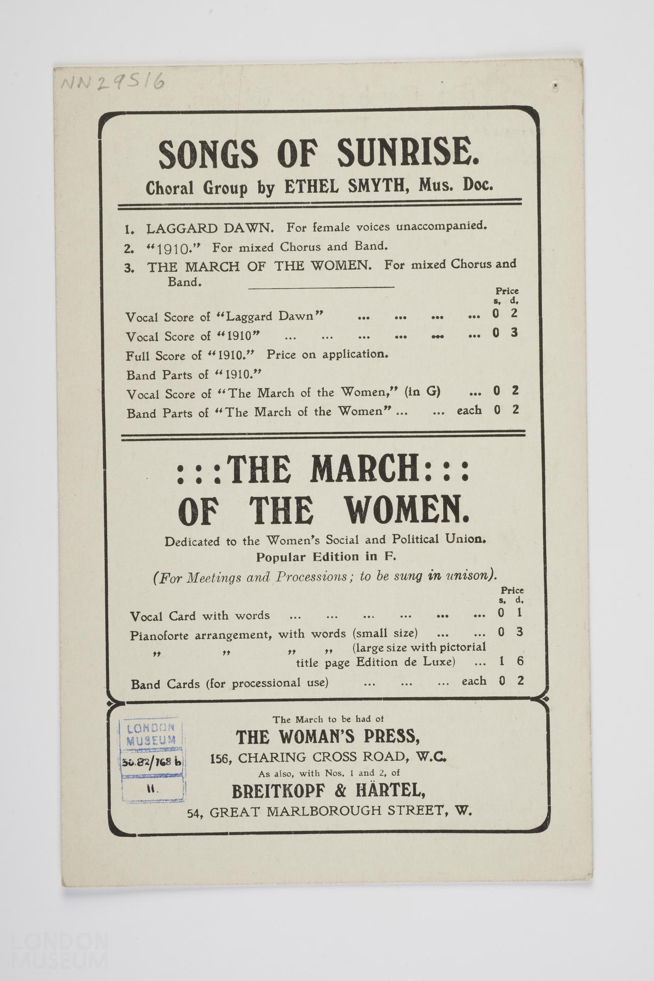 Music score and words for 'The March of the Women' dedicated to the Women's Social and Political Union. Composed by Ethel Smyth 1911. Printed on one side of a vocal card sold for 1d by The Woman's Press. On the reverse of the sheet are printed advertisements for other vocal cards. (Propagandist Songs and Poems).